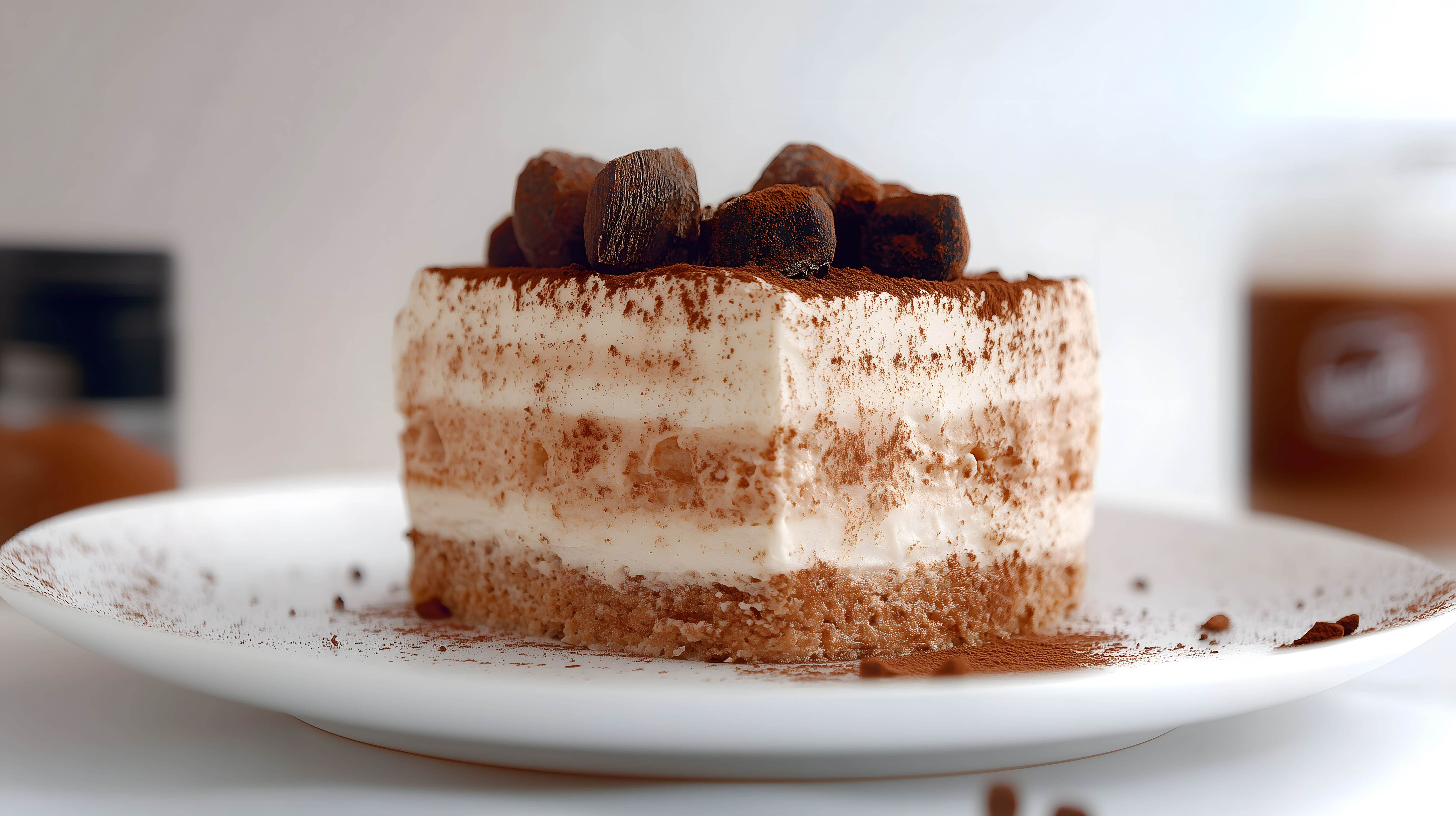 Das Foto zeigt einen köstlichen Tiramisu-Kuchen, der auf einem weißen Teller angerichtet ist. Der Kuchen besteht aus mehreren Schichten, die mit einer cremigen, kaffeearoma-gefüllten Mascarpone-Creme überzogen sind. Obenauf befinden sich einige dunkelbraune Trüffel, die das Bild dekorativ abrunden. Die Oberfläche des Kuchens ist mit feinem Kakaopulver bestäubt, was den Kontrast zwischen den hellen und dunklen Farbtönen noch verstärkt. Dieses appetitliche Dessert eignet sich perfekt als Eyecatcher in Blogs, Newslettern oder Werbematerialien zum Thema Backen, Feiern oder allgemeinen Genuss. Das kostenlose Stockfoto in hoher Auflösung steht unter Creative-Commons-Lizenz zur Verfügung.