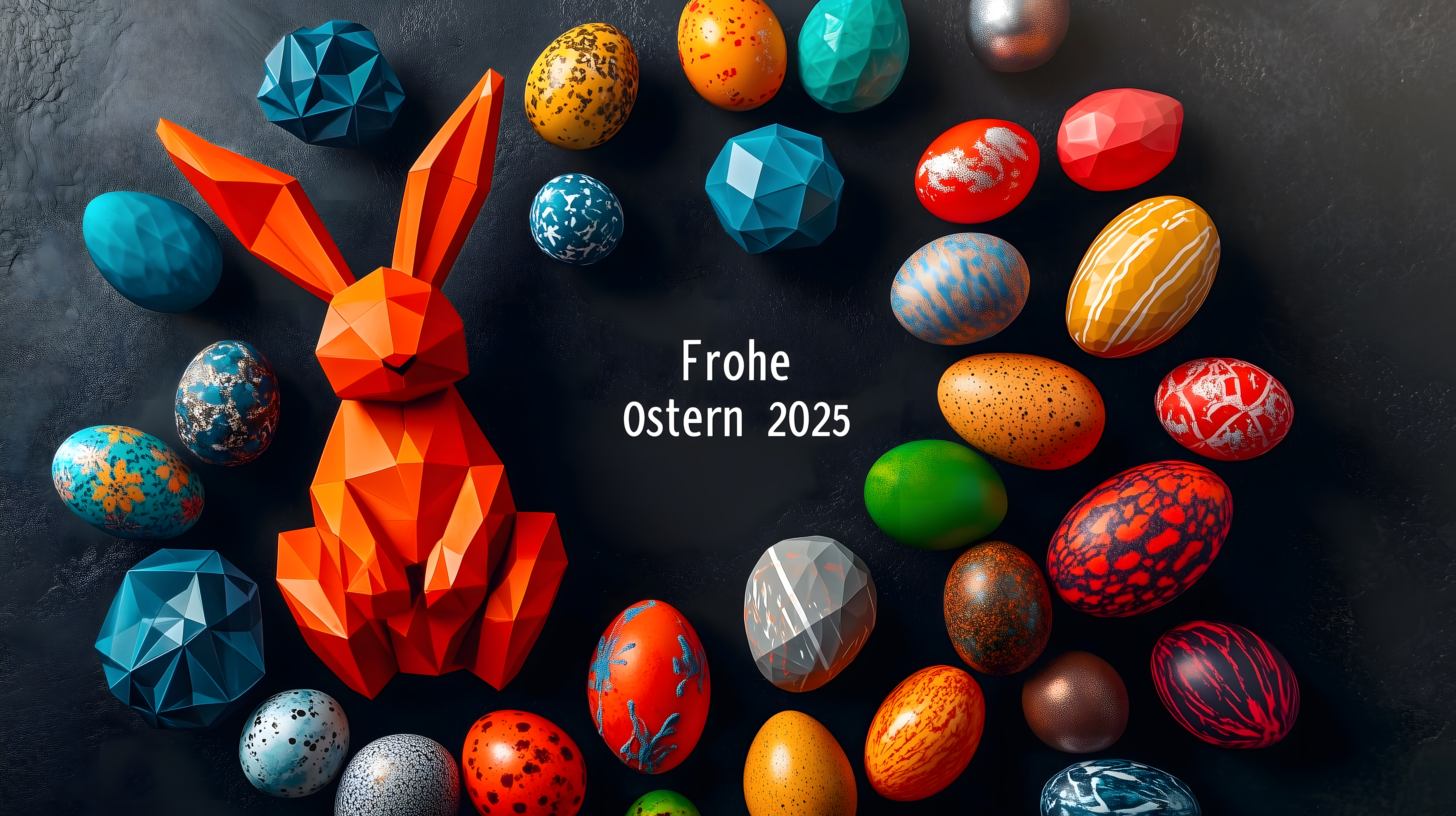 Dieses kreative Osterfoto zeigt eine Anordnung verschiedenfarbiger und geometrisch gestalteter Ostereier auf schwarzem Hintergrund. Der Mittelpunkt ist ein orangeroter, polygonaler Osterhase, umgeben von Eiern in Türkis, Rot, Grün und anderen Farbtönen. Die Kombination aus minimalistischen Formen und kräftigen, kontrastierenden Farben verleiht dem Bild einen modernen, ästhetischen Look. Dieses hochauflösende Stockfoto unter Creative-Commons-Lizenz eignet sich hervorragend für die Verwendung in Blogs, Newslettern, Werbekampagnen und Social-Media-Beiträgen rund um Ostern und Frühling.