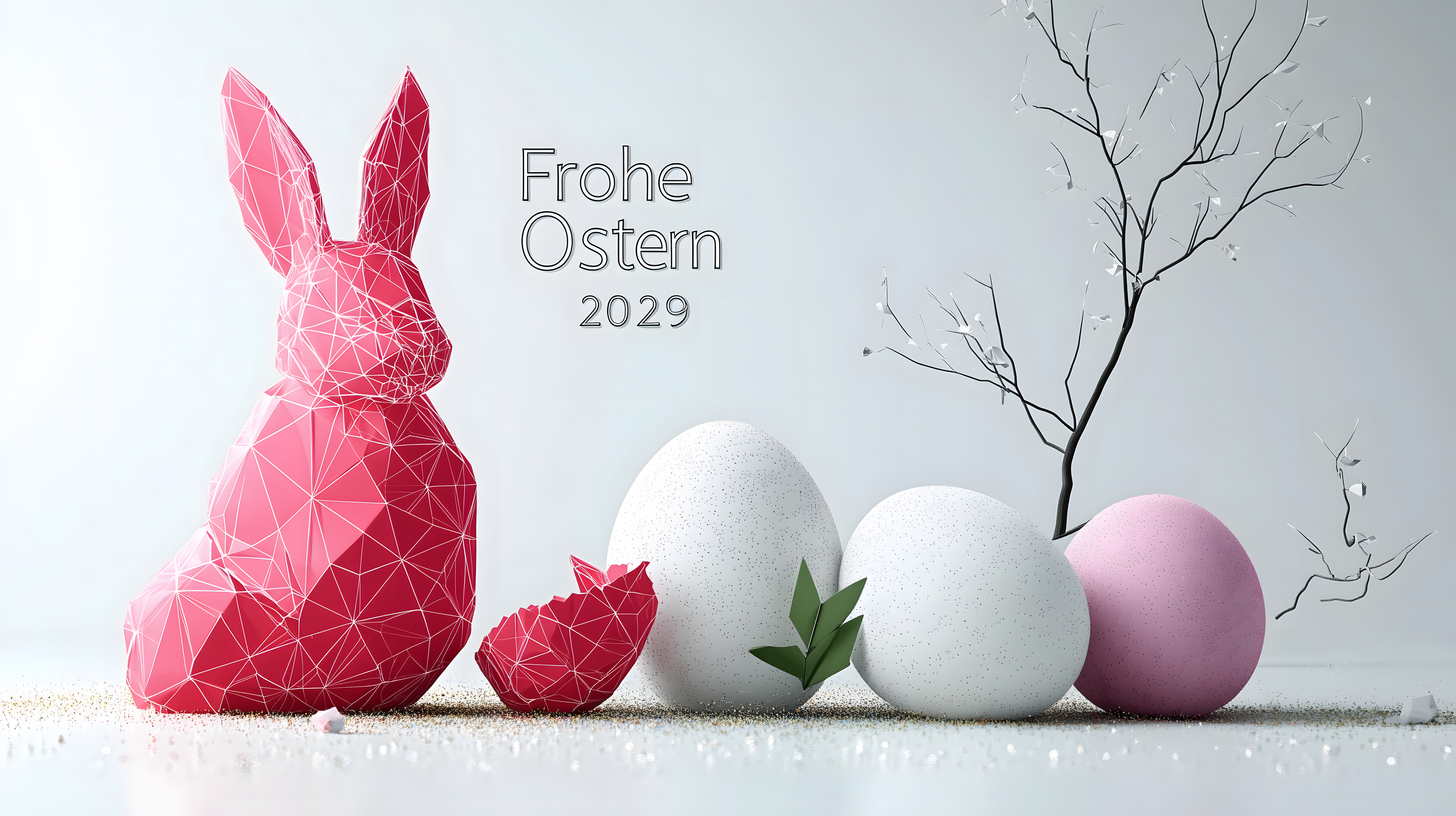 Dieses stimmungsvolle Osterfoto zeigt eine moderne, geometrische Darstellung eines Osterhasen in leuchtendem Pink sowie weiße und rosa Ostereier vor einem minimalistischen Hintergrund. Die polygonale Struktur der Hasen-Figur verleiht dem Bild einen abstrakten, digitalen Look, während die natürlichen Elemente wie die Zweige und der sandige Untergrund für einen Kontrast sorgen. Mit seiner klaren Komposition und den pastellfarbenen Akzenten eignet sich dieses Osterbild perfekt für den Einsatz in Blogs, Newslettern oder Werbematerialien rund um das Osterfest. Das hochauflösende Stockfoto steht unter einer Creative-Commons-Lizenz zur Verfügung.