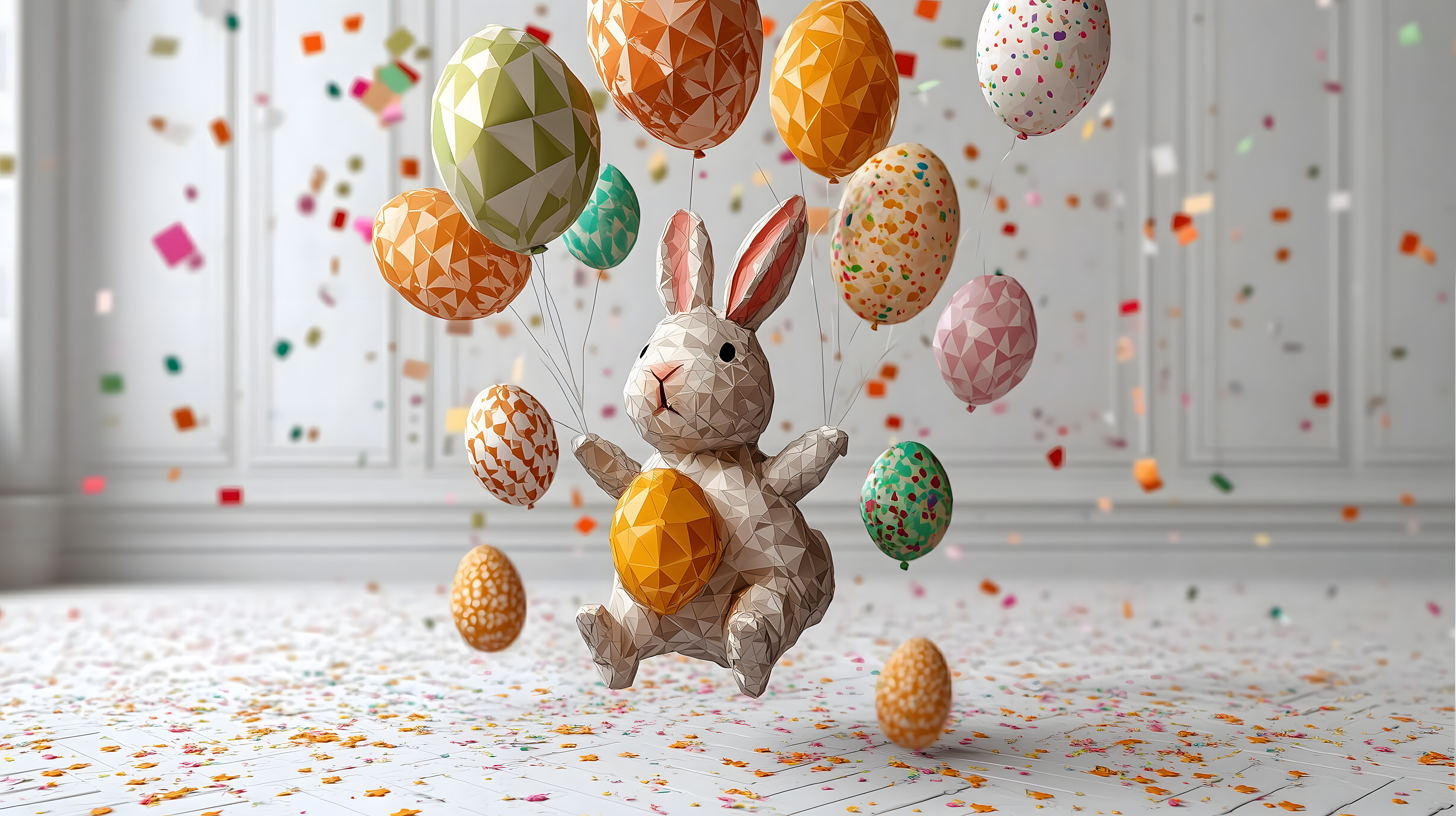 Dieses fantasievolle Bild zeigt einen Osterhasen, der von bunten, geometrisch gemusterten Ostereiern umgeben ist. Der Hase selbst ist auch aus polygonalen Formen zusammengesetzt und schwebt vor einem hellen Fenster, umgeben von funkelnden Konfettiteilchen. Die Farbpalette umfasst warme Töne wie Orange, Gelb und Rosa sowie kühle Akzente wie Mintgrün. Dieses Stockfoto eignet sich hervorragend für den Einsatz in Oster-Dekorationen, Grußkarten, Webseiten oder Werbekampagnen rund um das Frühlingsfest. Das hochauflösende Bild unter Creative-Commons-Lizenz kann kostenlos heruntergeladen und vielfältig genutzt werden.