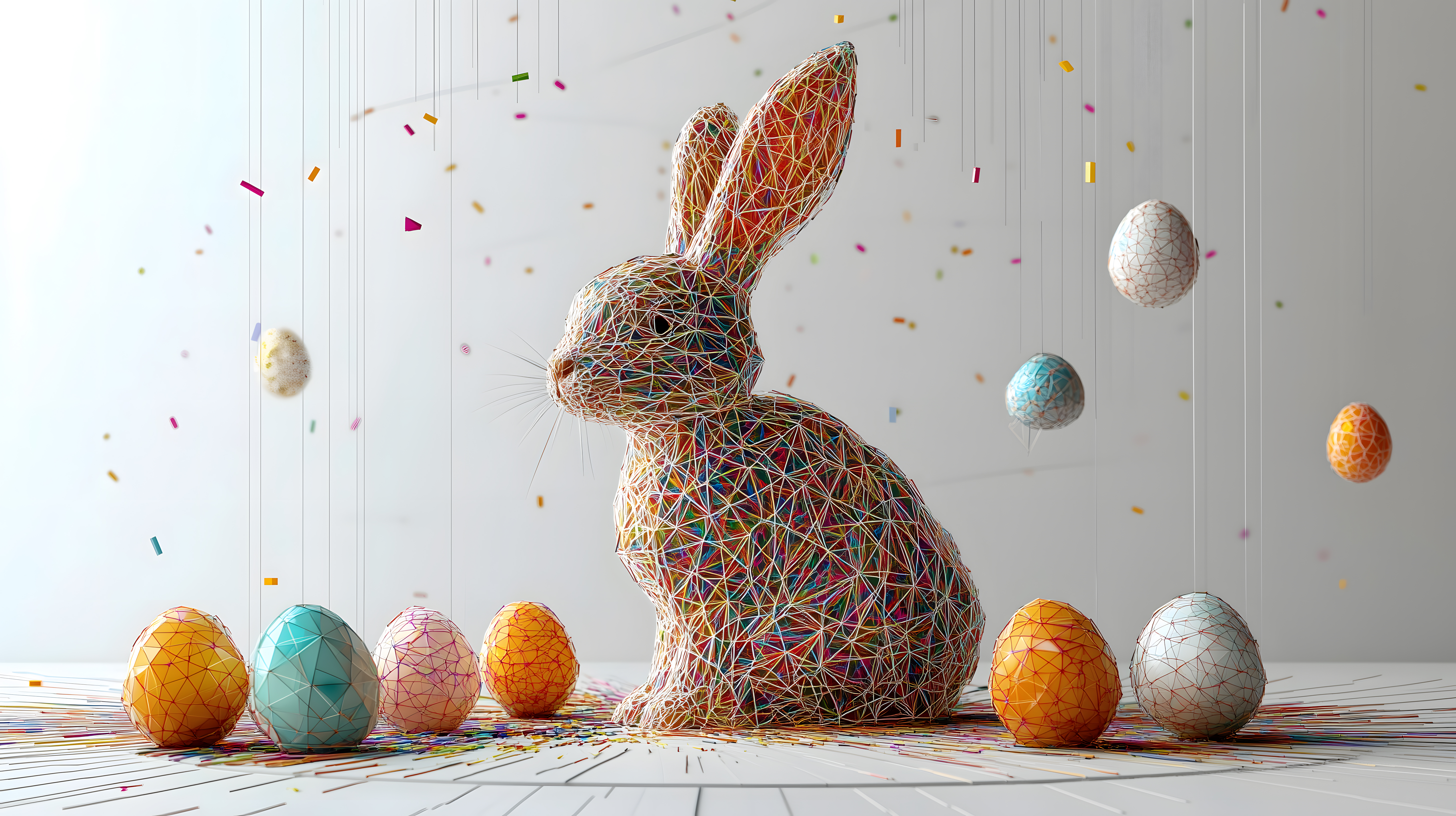 Dieses Stockfoto zeigt ein abstraktes Osterdekoelement in Form eines bunten Drahtkonstrukt-Osterhasen, umgeben von verschiedenfarbigen, polygonalen Ostereiern. Die Komposition spielt mit Kontrasten, Formen und Farben, um eine minimalistische, aber dennoch kreative und dekorative Atmosphäre zu schaffen. Die Drahttextur und die geometrischen Muster verleihen dem Bild einen modernen, grafischen Charakter. Das Foto eignet sich hervorragend als Hintergrund oder Gestaltungselement für Blogbeiträge, Newsletterdesigns, Social-Media-Posts und Werbemittel rund um Ostern. Dieses hochauflösende Stockfoto steht unter der Creative-Commons-Lizenz zur kostenfreien Nutzung zur Verfügung.