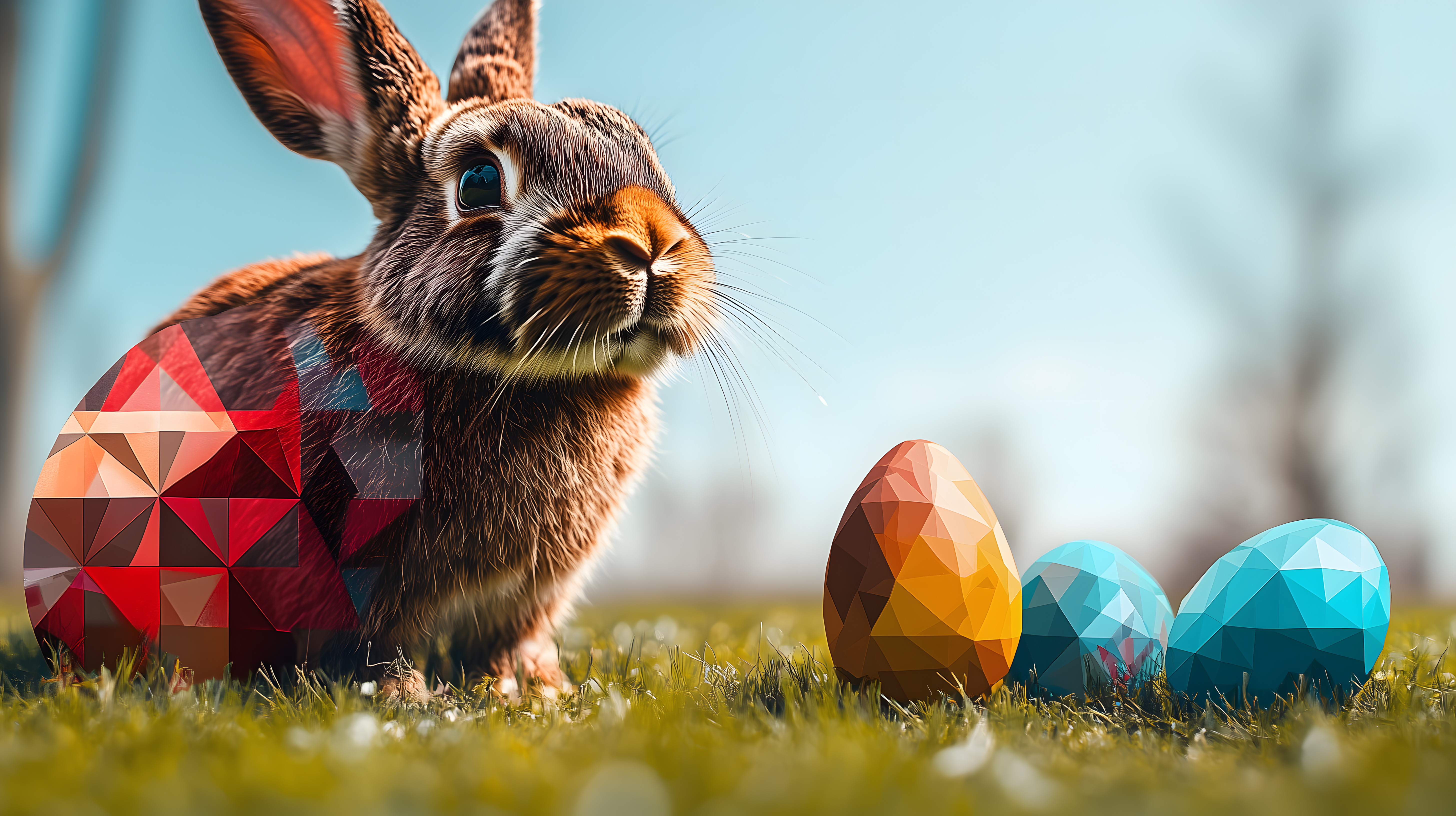 Dieses hochauflösende Foto zeigt einen realistischen Osterhasen inmitten bunter, polygonaler Ostereier in einer grünen Wiese. Der Hase blickt direkt in die Kamera mit seinen lebendigen Augen und seinem flauschigen, braunen Fell. Die Eier in unterschiedlichen Farbtönen von Rot, Orange, Gelb und Blau fügen sich harmonisch in die Szene ein und schaffen einen geometrischen, kreativen Kontrast zum natürlichen Hintergrund. Dieses Stockfoto eignet sich hervorragend für Ostern-Designs, Grußkarten, Webseiten und Social-Media-Posts rund um das Osterfest. Die Bilddatei ist unter einer Creative-Commons-Lizenz verfügbar und kann kostenlos heruntergeladen werden.