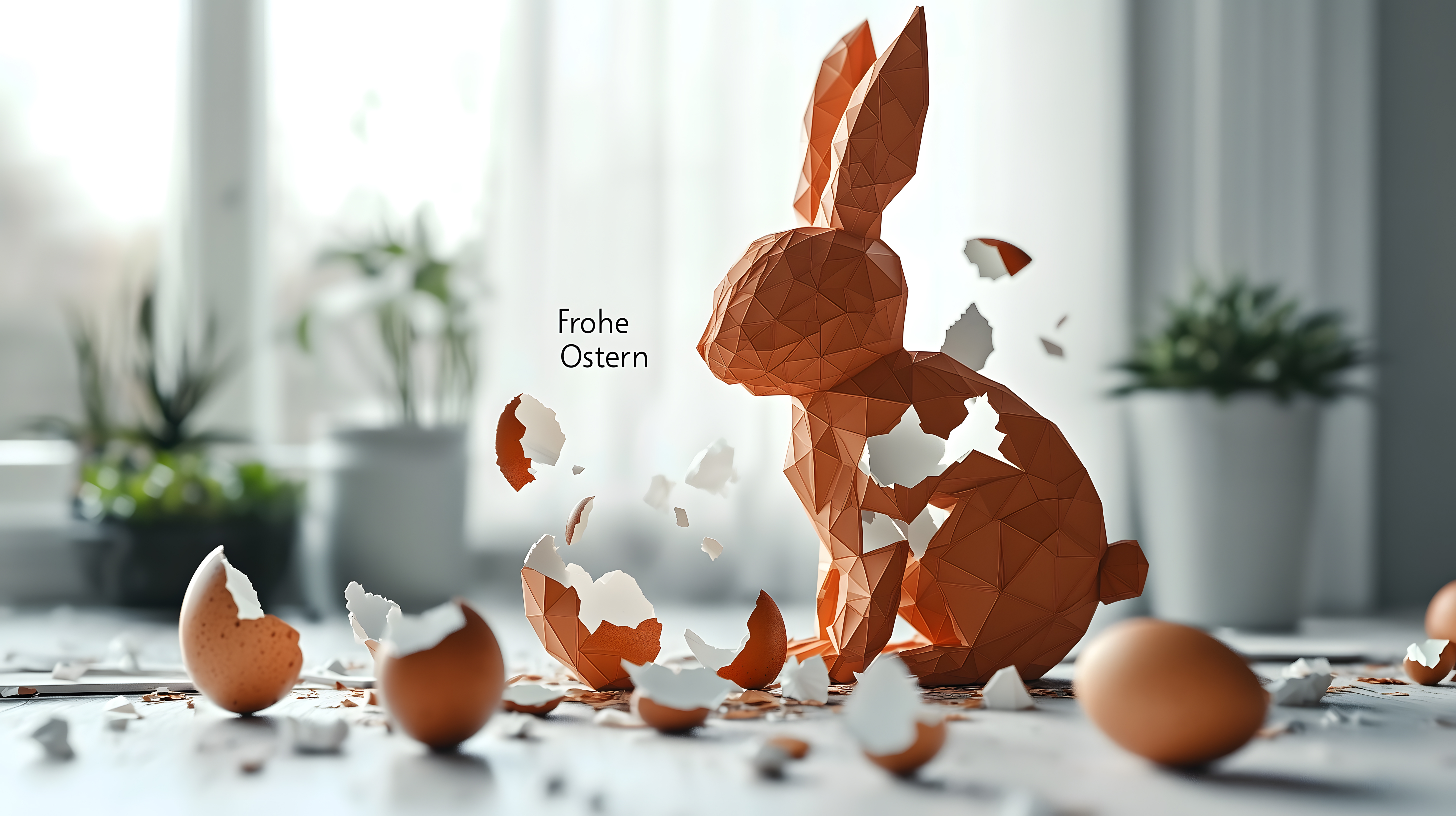 Dieses Bild zeigt einen Osterhasen, der aus geometrischen Polygonen zusammengesetzt ist. Der Hase ist in einem rötlich-braunen Farbton gehalten und steht vor einem hellen, verschwommenen Hintergrund mit Zimmerpflanzen und einem Fenster. Um den Hasen herum liegen zerbrochene Eierschalen, die den Eindruck erwecken, als wäre der Hase selbst aus diesen Fragmenten entstanden.