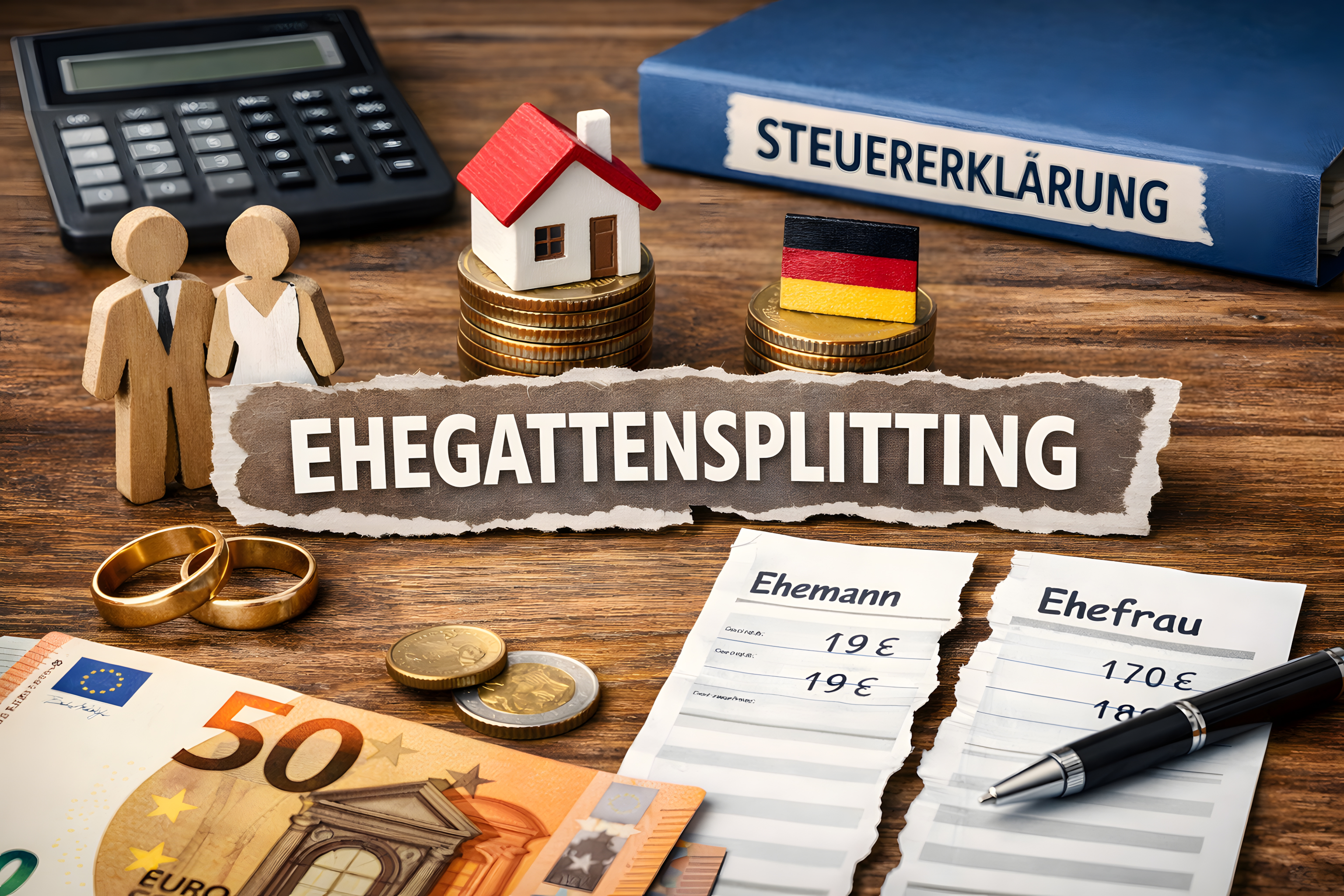 Das Foto zeigt eine Szene rund um das Thema Ehegattensplitting. Im Vordergrund sind Unterlagen zu sehen, die offenbar eine Scheidung dokumentieren. Dazu gehören ein zerrissenes Dokument, eine Feder und Münzen. Außerdem sind eine Flagge der Europäischen Union sowie ein Taschenrechner abgebildet. Das Ehegattensplitting ist ein steuerliches Konzept in Deutschland, bei dem Ehepaare ihre Einkünfte zusammenlegen und gemeinsam versteuern können, was in manchen Fällen zu Steuereinsparungen führt. Die Darstellung der Scheidungsunterlagen und des Finanzstresses lässt auf mögliche Konflikte oder Komplikationen im Zusammenhang mit dem Ehegattensplitting schließen. Das Foto könnte für Beiträge zu Finanzthemen, rechtlichen Aspekten oder persönlichen Erfahrungen rund um Ehe und Scheidung verwendet werden.