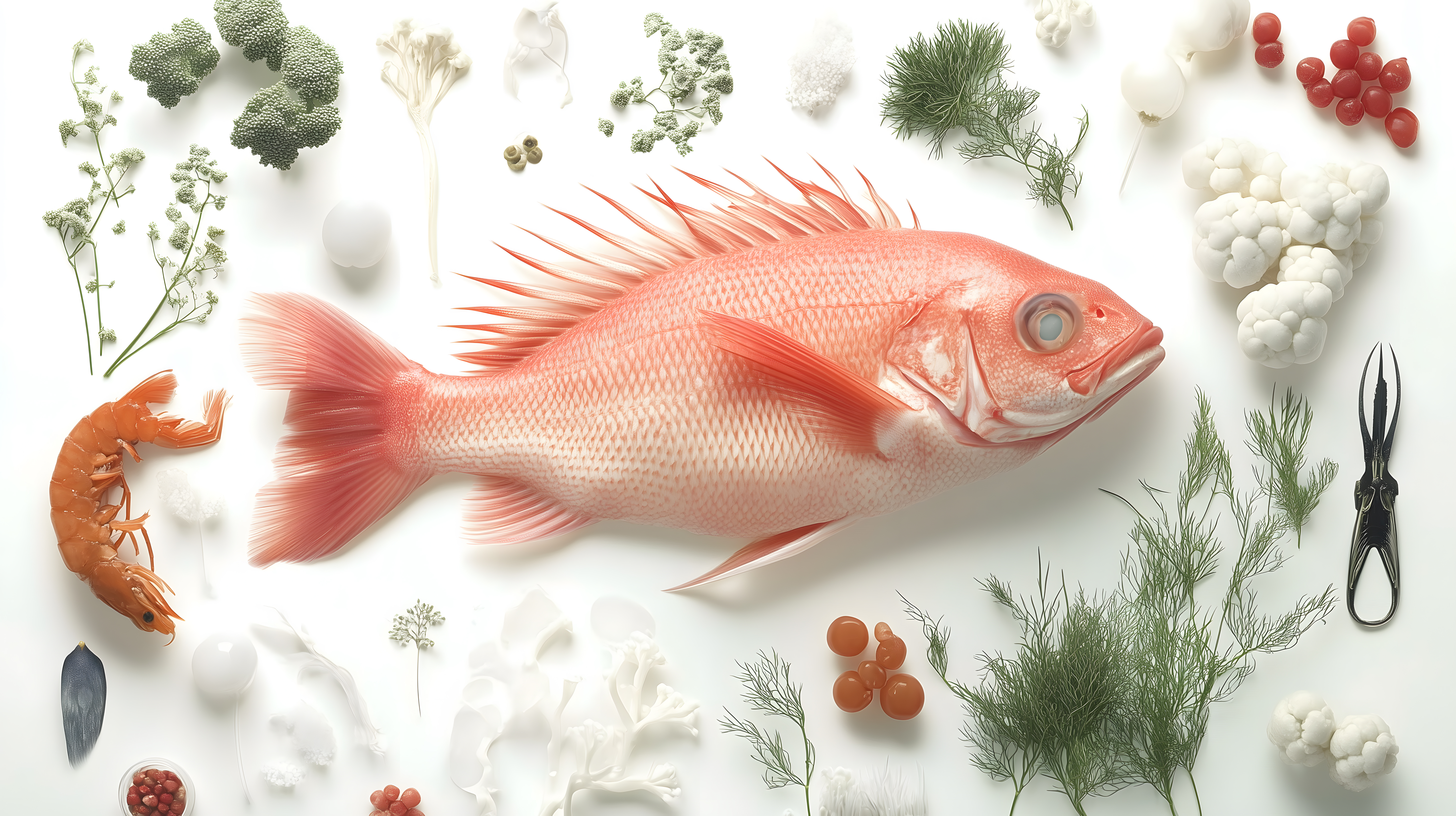 Das Bild zeigt eine Vielzahl an frischen Meeresfrüchten und Gemüsesorten auf einem weißen Hintergrund. Der Mittelpunkt ist ein großer, roter Heilbutt, umgeben von Brokkoli, Blumenkohl, Dill, Tomaten und Krebsen. Die Anordnung der Objekte schafft eine harmonische, natürliche Komposition, die an ein Stillleben erinnert. Diese hochauflösende Fotografie eignet sich perfekt als kostenloses Stockfoto für Blogs, Newsletter, Social-Media-Kanäle oder Werbematerialien rund um die Themen Kochen, Ernährung und Gourmet-Küche. Die Bilder sind unter einer Creative Commons-Lizenz verfügbar.