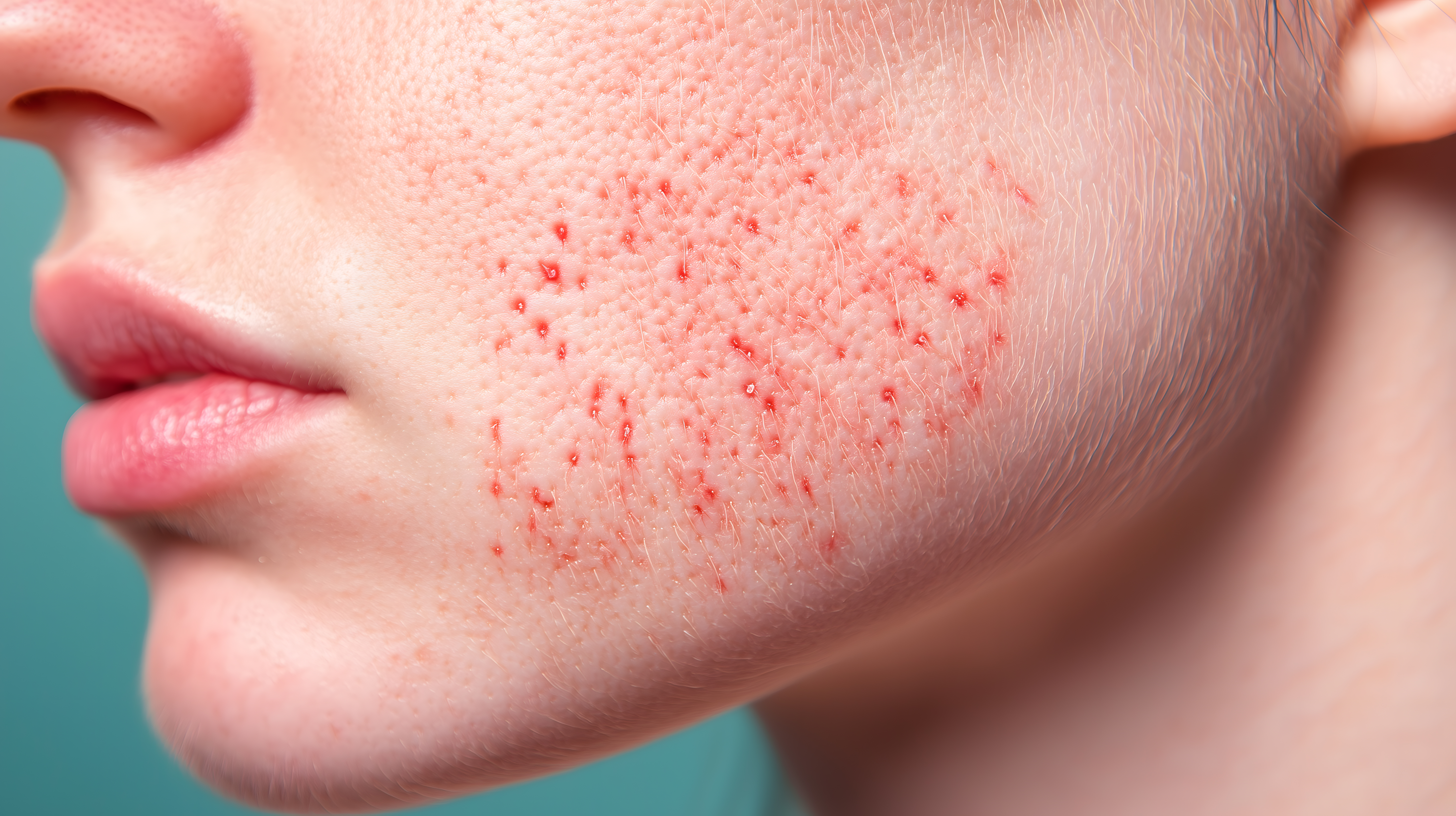 Dieses hochauflösende Nahaufnahme-Foto zeigt eine starke Hautirration im Gesicht, die durch Akne verursacht wird. Die Haut ist stark gerötet und weist zahlreiche kleine, entzündete Pickel auf. Diese Hautirritation kann verschiedene Ursachen haben und betrifft viele Menschen, vor allem im Jugendalter. Das Foto eignet sich für den Einsatz in medizinischen, kosmetischen oder gesundheitsorientierten Kontexten, z.B. für Blogbeiträge, Social-Media-Posts oder Werbekampagnen rund um Hautpflege und Dermatologie. Es ist ein hochwertiges, kostenloses Stockfoto, das unter einer Creative-Commons-Lizenz veröffentlicht wurde.