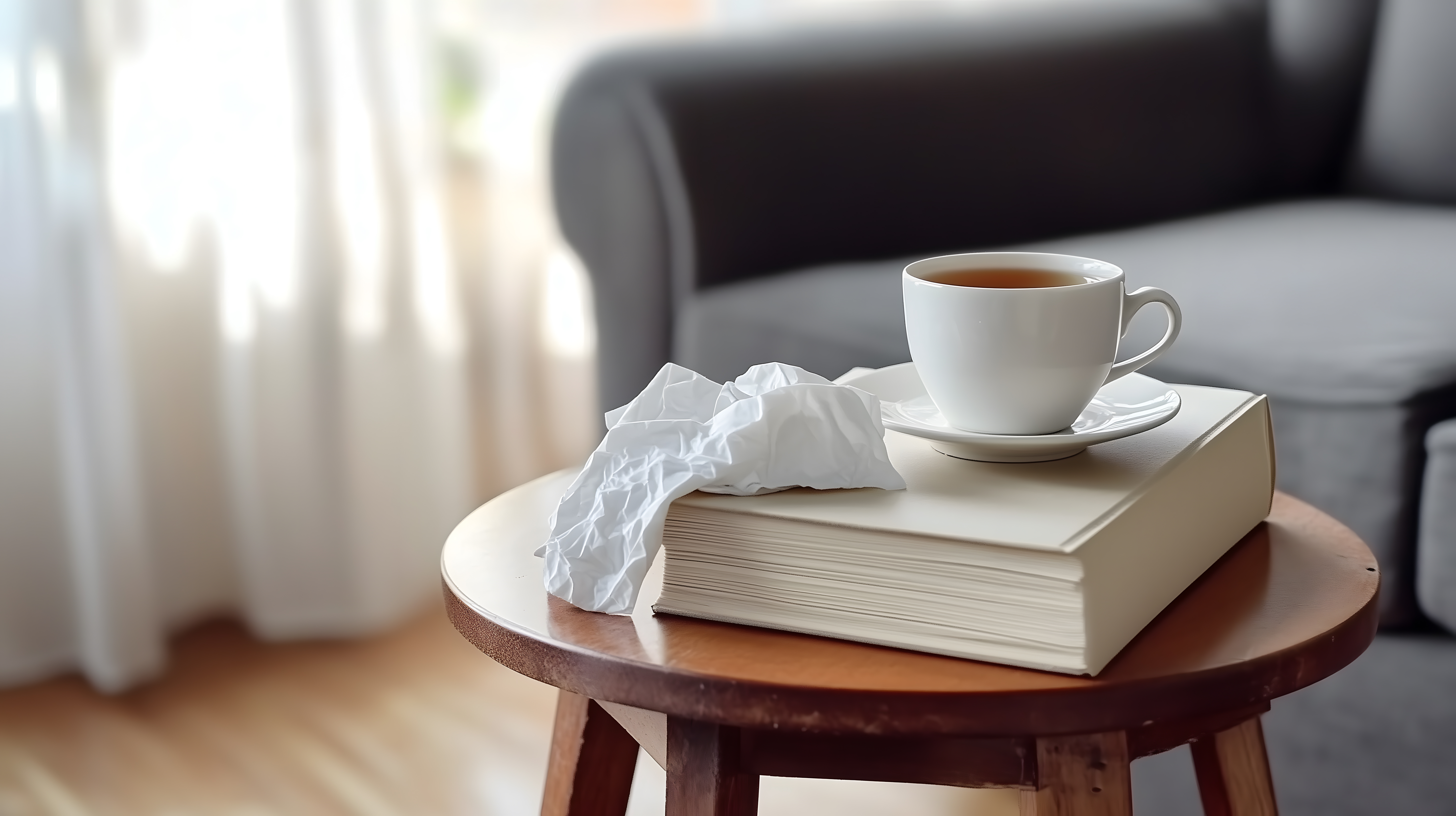 Das Bild zeigt eine gemütliche Leseecke mit einem Holztisch, auf dem eine weiße Teetasse und ein zerknittertes Taschentuch auf einem aufgeschlagenen Buch stehen. Im Hintergrund ist eine Couch zu sehen, durch das Fenster dringt mildes Sonnenlicht in den Raum. Die Szene vermittelt eine Atmosphäre der Entspannung und Ruhe, ideal für ein kleines Pausenmoment bei Krankheit oder Erkältung. Dieses kostenlose Stockfoto in hoher Auflösung unter Creative-Commons-Lizenz eignet sich perfekt für Blogs, Newsletter oder Werbung, um eine gemütliche und einladende Stimmung zu schaffen.