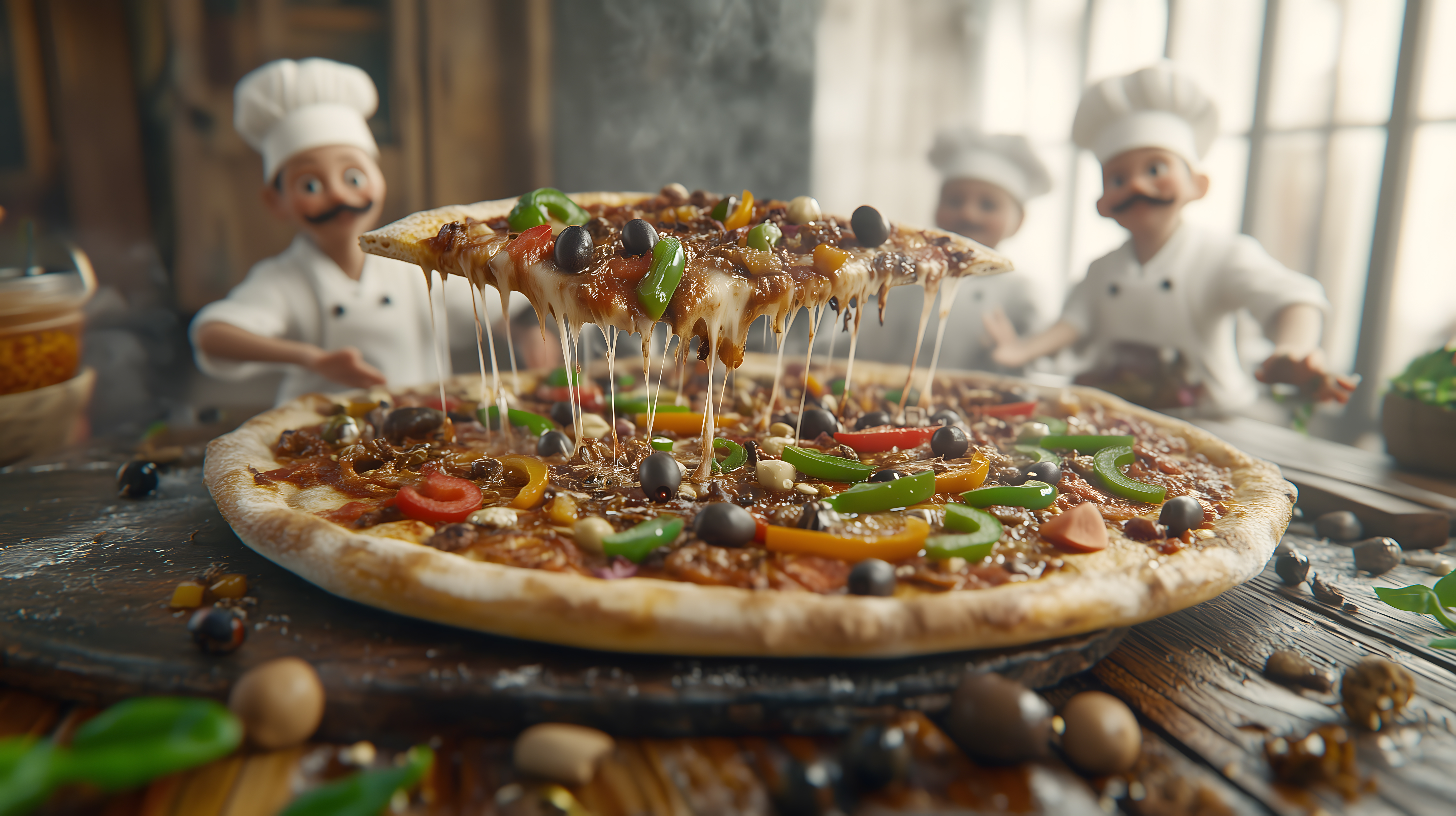 Das Bild zeigt eine frisch zubereitete Gemüsepizza mit einem köstlichen, schmelzenden Käseüberzug. Der Pizza-Teig ist knusprig-goldbraun gebacken, und der Belag besteht aus einer Vielfalt an Gemüse wie Paprika, Tomaten, Oliven und anderen Zutaten. Die Zubereitung der Pizza wird von zwei Köchen in traditioneller Küchenbekleidung überwacht, was eine authentische Atmosphäre schafft. Dieses hochauflösende Stockfoto eignet sich hervorragend für den Einsatz in Blogs, Newslettern, sozialen Medien oder Werbematerialien im Bereich Gastronomie, Kulinarik und Ernährung. Als kostenloses Stockfoto unter Creative-Commons-Lizenz ist es frei verwendbar.
