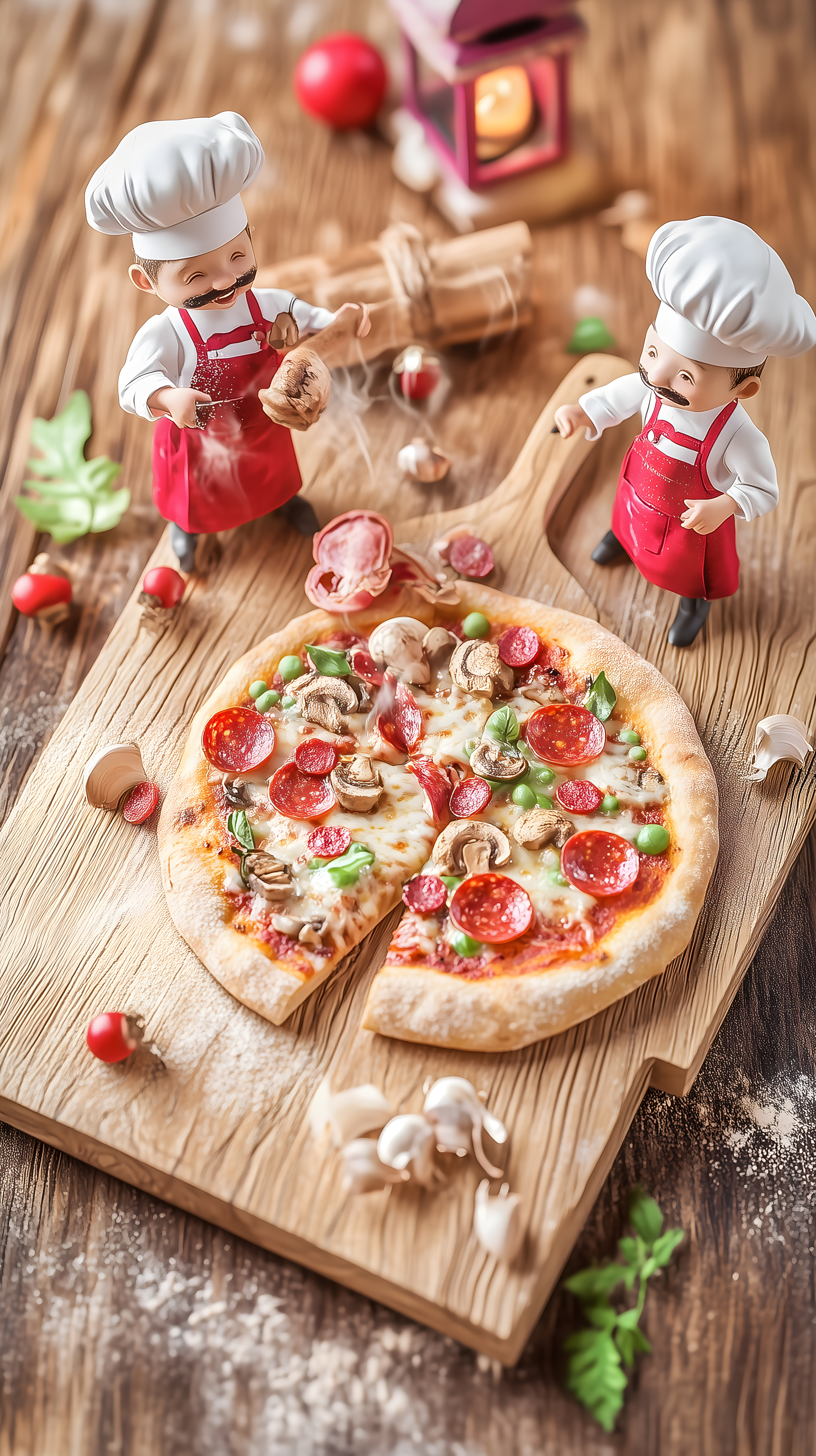 Dieses Bild zeigt eine bunte Pizza mit Pilzen und Salami, die auf einem rustikalen Holzbrett präsentiert wird. Im Vordergrund sind zwei Kochfiguren zu sehen, die an der Pizza arbeiten. Das Bild besticht durch seine lebendigen Farben, den Kontrast zwischen der rustikalen Holzoptik und der modernen Pizza sowie die detaillierten Darstellungen der Zutaten. Es eignet sich hervorragend als kostenloses Stockfoto für diverse Einsatzbereiche wie Food-Blogs, Rezept-Websites, Social-Media-Posts oder Werbemittel der Gastronomie in hoher Auflösung und unter Creative-Commons-Lizenz.