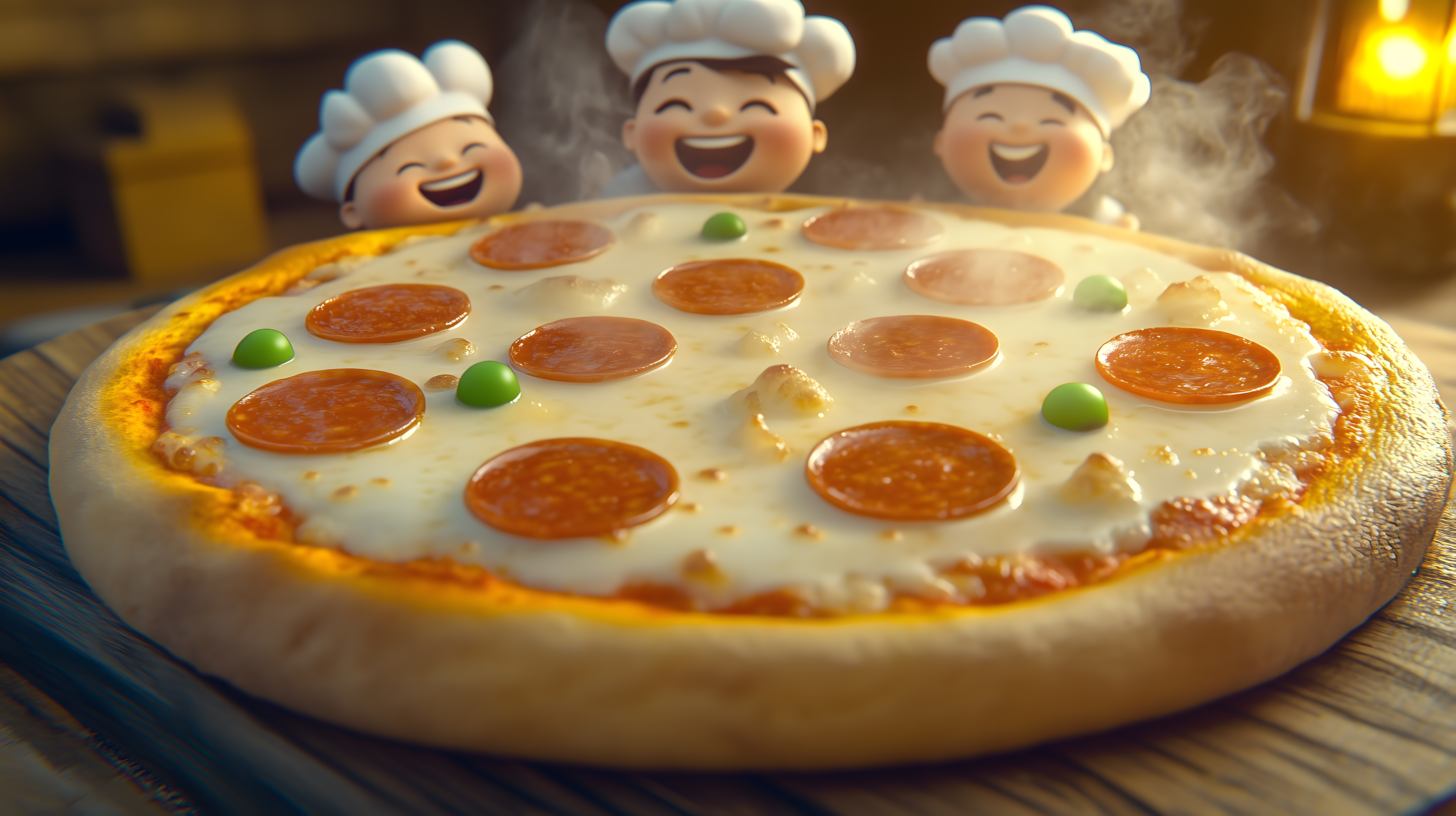 Das Foto zeigt drei fröhliche Köche, die eine dampfende, frisch zubereitete Pizza auf einem Holztisch präsentieren. Die Pizza ist mit Pepperoni, Käse und Erbsen belegt und strahlt eine appetitliche Atmosphäre aus. Die Köche tragen traditionelle Kochmützen und lachen glücklich, was eine positive und einladende Stimmung vermittelt. Dieses Stockfoto eignet sich hervorragend für Verwendung in Blogs, Newslettern, Social-Media-Beiträgen oder Werbekampagnen zum Thema Essen, Kochen und Gastronomie. Das Bild ist in hoher Auflösung und unter einer Creative-Commons-Lizenz frei verfügbar.