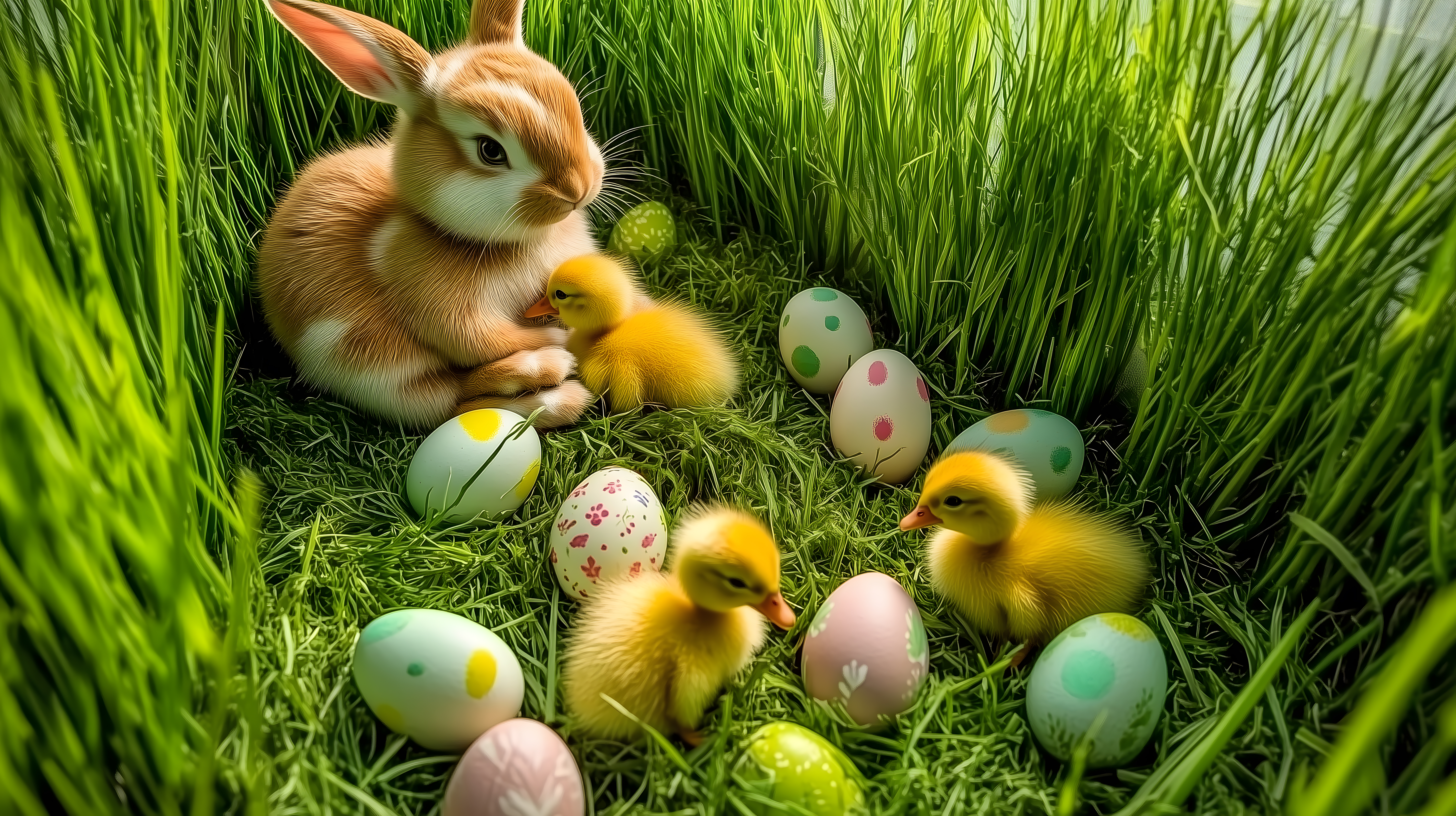 Dieses detailreiche Foto zeigt eine charmante Osterhasenfamilie umgeben von Babykükchen und bunten Eiern auf einer saftig grünen Wiese. Die Hasen und Küken schauen direkt in die Kamera, was eine niedliche, lebendige Szene schafft. Die warmen Farbtöne und die Perspektive aus der Nähe verleihen dem Bild einen besonderen Charme. Es eignet sich hervorragend als Hintergrund- oder Dekorationsfoto für Ostern, Frühling oder generell für einen natürlichen, farbenfrohen Look in Blogs, Newslettern oder Social-Media-Beiträgen. Das hochauflösende, kostenlose Stockfoto unter Creative-Commons-Lizenz ist in verschiedenen Formaten verfügbar.