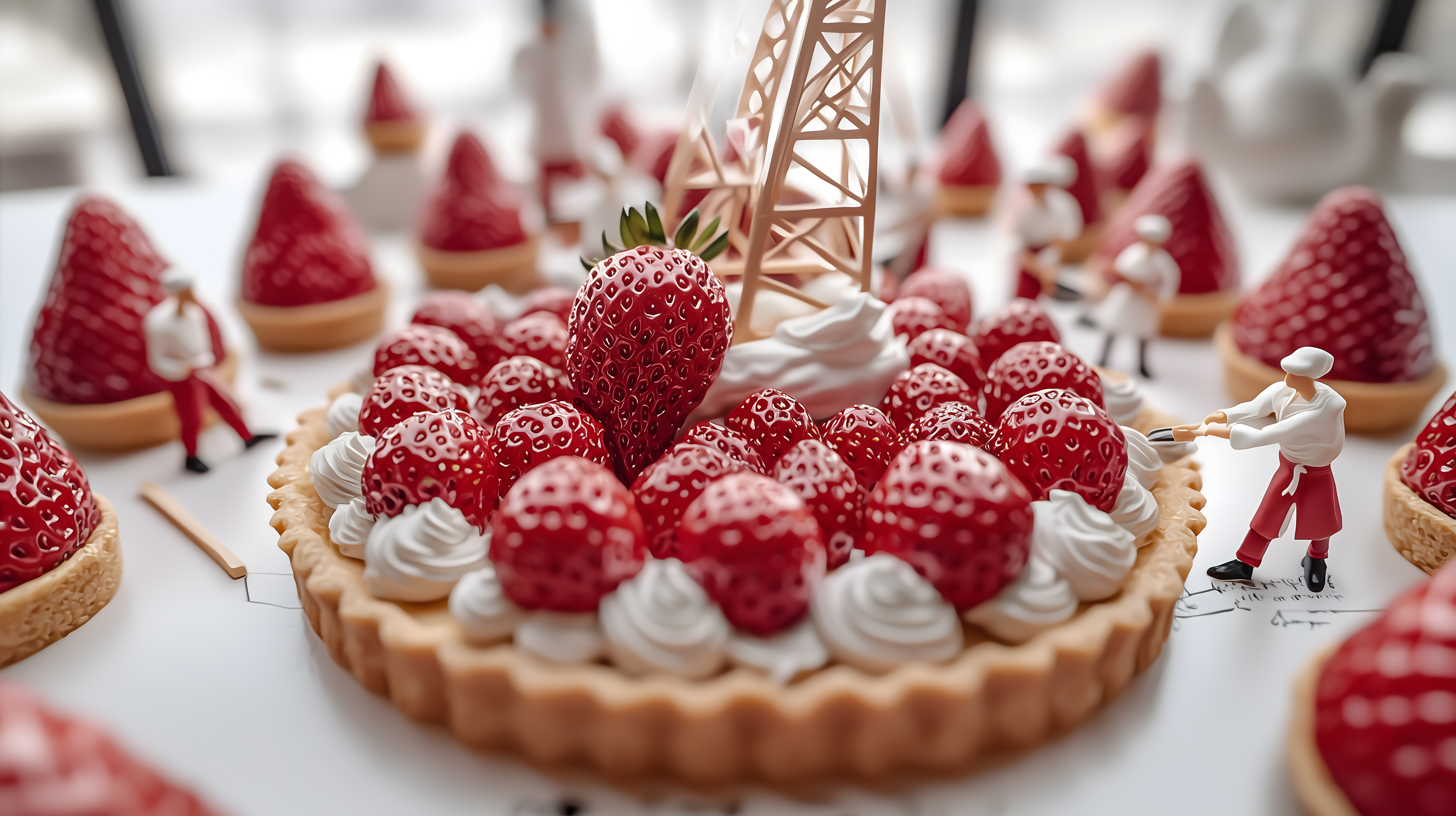 Das Foto zeigt eine Reihe köstlicher hausgemachter Erdbeertörtchen, die mit einer cremigen, weißen Dekoration verziert sind. Die roten, glänzenden Erdbeeren sind sorgfältig auf den Törtchen angeordnet und verleihen ihnen ein appetitliches Aussehen. In der Mitte thront ein stilisierter Eiffelturm-Dekor, der dem Arrangement eine romantische Note verleiht.