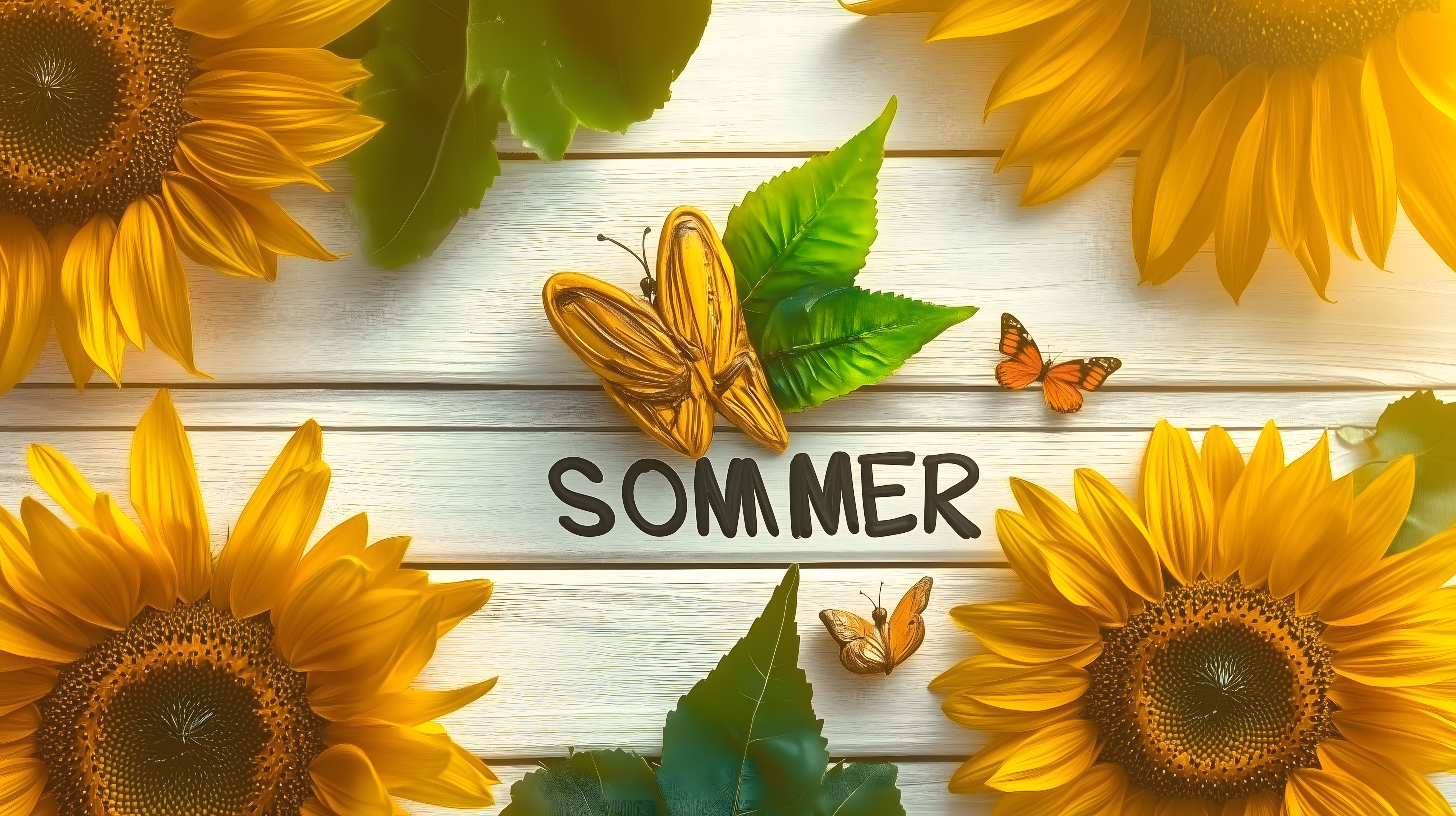 Dieses farbenprächtige Foto zeigt eine sommerliche Deko-Szene mit gelben Sonnenblumen, grünen Blättern und zarten Schmetterlingen auf einer rustikalen Holzoberfläche. Die Komposition ist natürlich und stimmungsvoll, mit viel Freiraum für Text oder Overlays. Das hochauflösende Bild eignet sich hervorragend für verschiedene Anwendungen, wie Blogbeiträge, Newsletter, Social-Media-Posts oder Werbematerial. Es steht unter einer kostenlosen Creative-Commons-Lizenz zur Verfügung und kann somit vielseitig und ohne Lizenzgebühren genutzt werden.