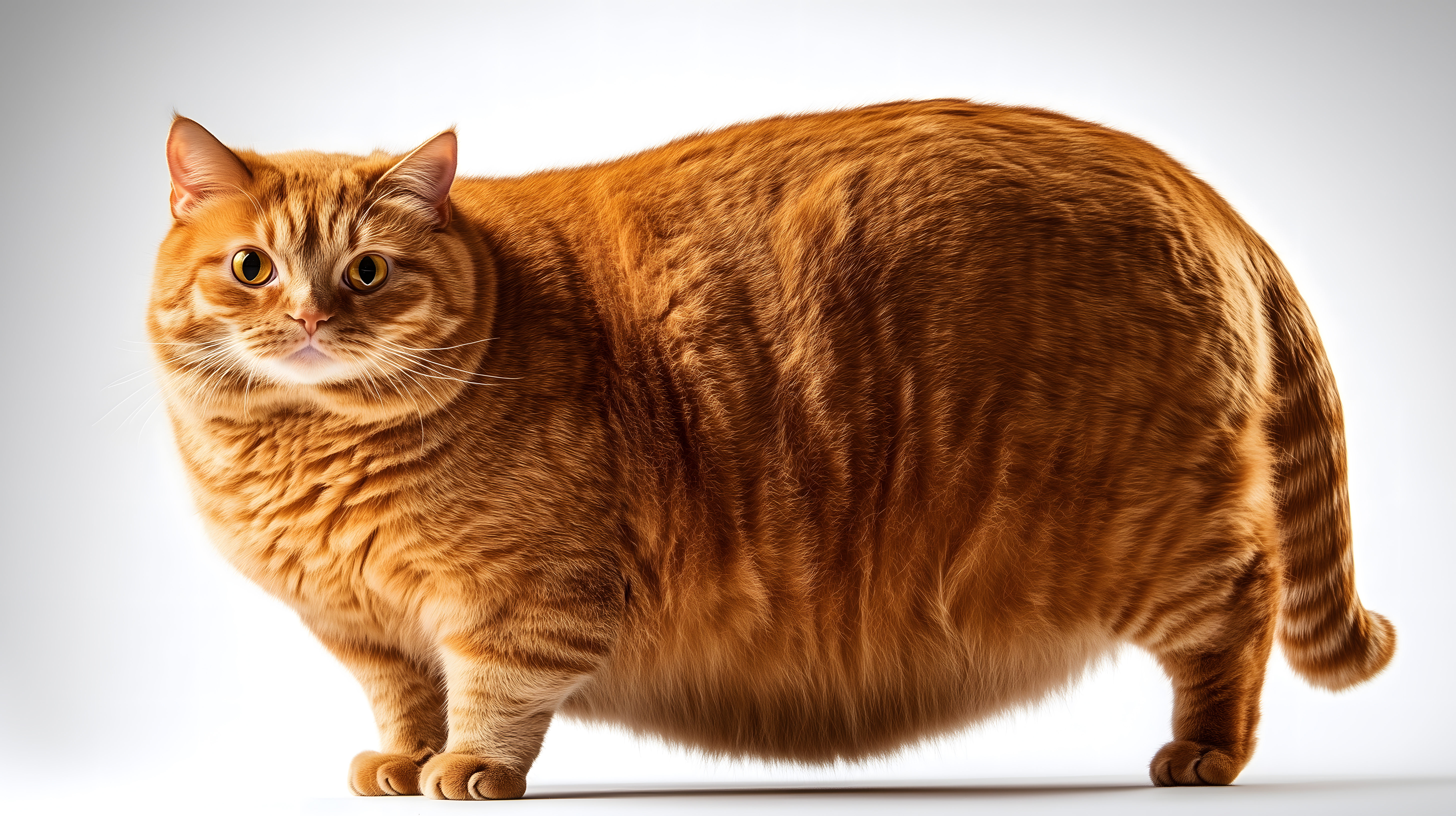 Dieses Foto zeigt eine pelzige, orangefarbene Hauskatze, die vor einem weißen Hintergrund steht. Die Katze nimmt fast die gesamte Bildkomposition ein und ist detailliert in ihrer Fellstruktur und Körperform zu erkennen. Ihre großen, aufmerksamen Augen blicken direkt in die Kamera, was dem Bild einen natürlichen und lebendigen Ausdruck verleiht.