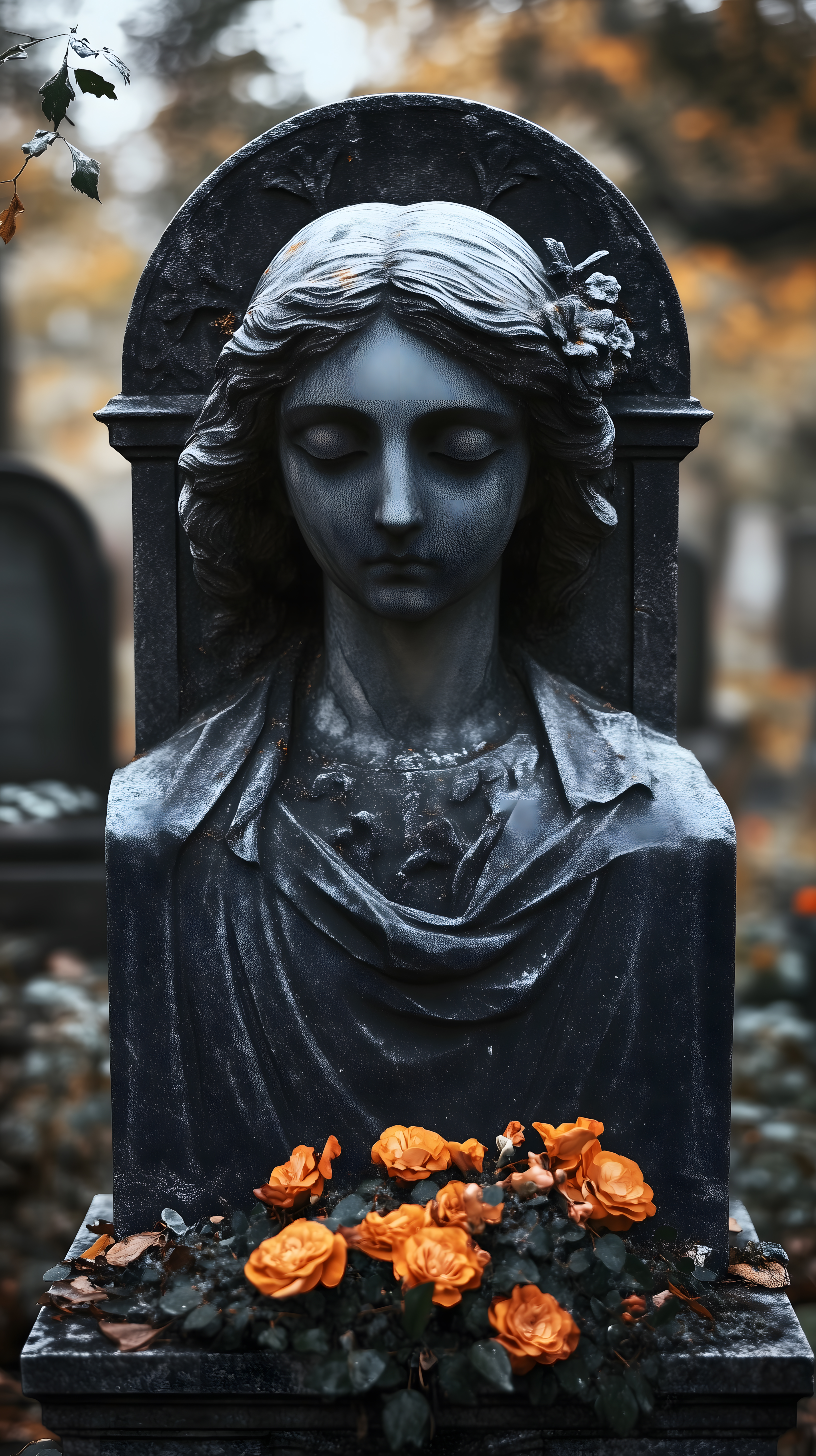 Das Bild zeigt eine Engelstatue auf einem Grabstein, umgeben von herbstlichen, orangen Blumen. Die detailreich gestaltete Statue hat geschlossene Augen und einen nachdenklichen Ausdruck. Der düstere, schwarz-weiße Kontrast sowie die Blumen verleihen dem Motiv eine melancholische und mystische Stimmung. Dieses kostenfrei nutzbare Stockfoto in hoher Auflösung eignet sich hervorragend für Blogbeiträge, Hochzeits- oder Trauerdekorationen, Newsletter oder Social-Media-Posts mit Themen rund um Trauer, Tod, Friedhofskunst oder Herbststimmung. Die Rechte an diesem Bild stehen unter der Creative-Commons-Lizenz zur Verfügung.