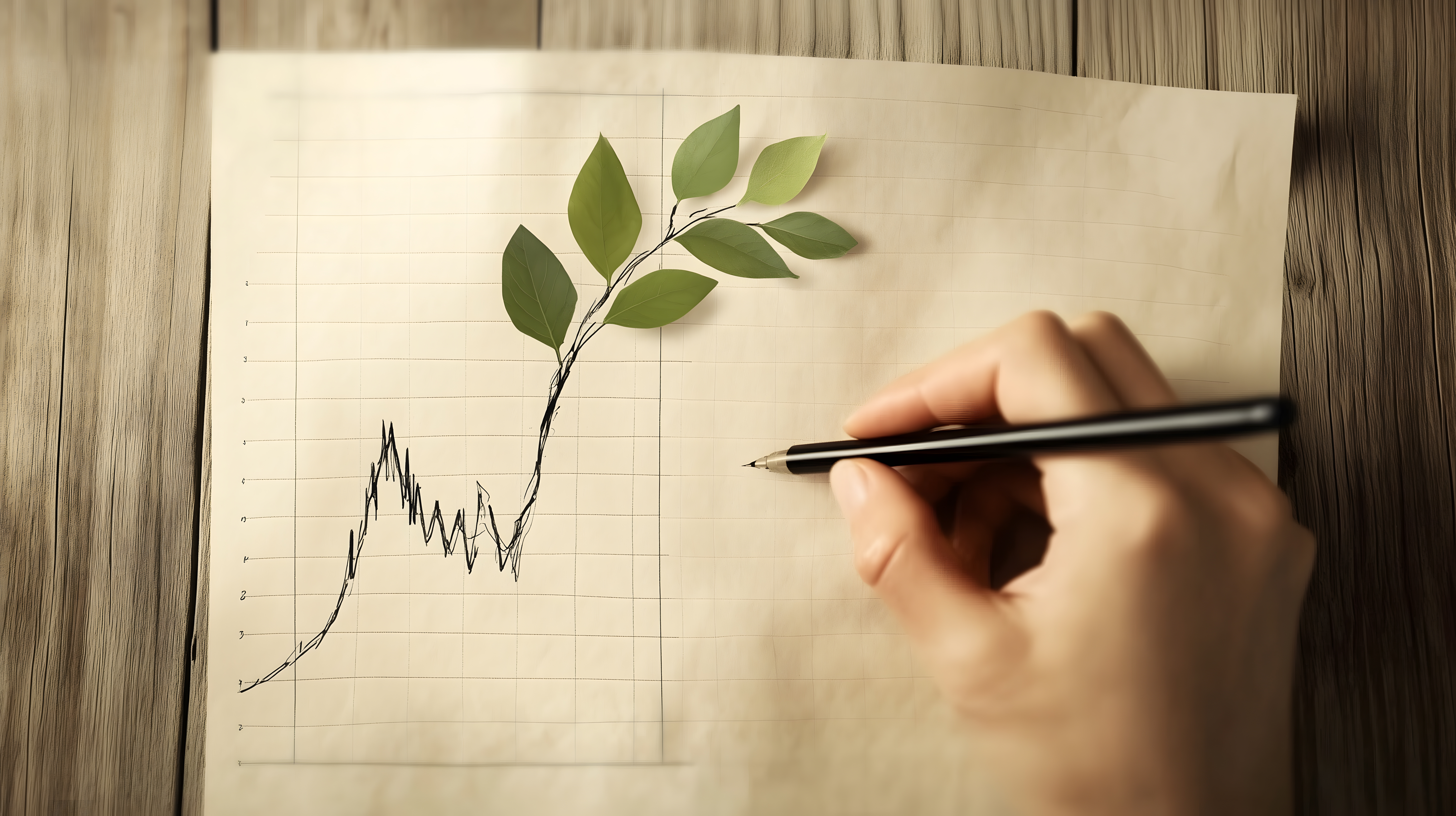 Dieses Foto zeigt eine handgezeichnete Grafik auf einem Blatt Papier, die einen finanziellen Wachstumsverlauf symbolisiert. Die Zeichnung stellt eine Pflanze dar, deren Zweige in einer Wellenlinie verlaufen und somit die Dynamik und Entwicklung des Marktes widerspiegeln. Der rustikale, natürliche Stil mit dem Holzhintergrund und dem Schreibstift in der Hand vermittelt einen ruhigen, nachdenklichen Eindruck.
