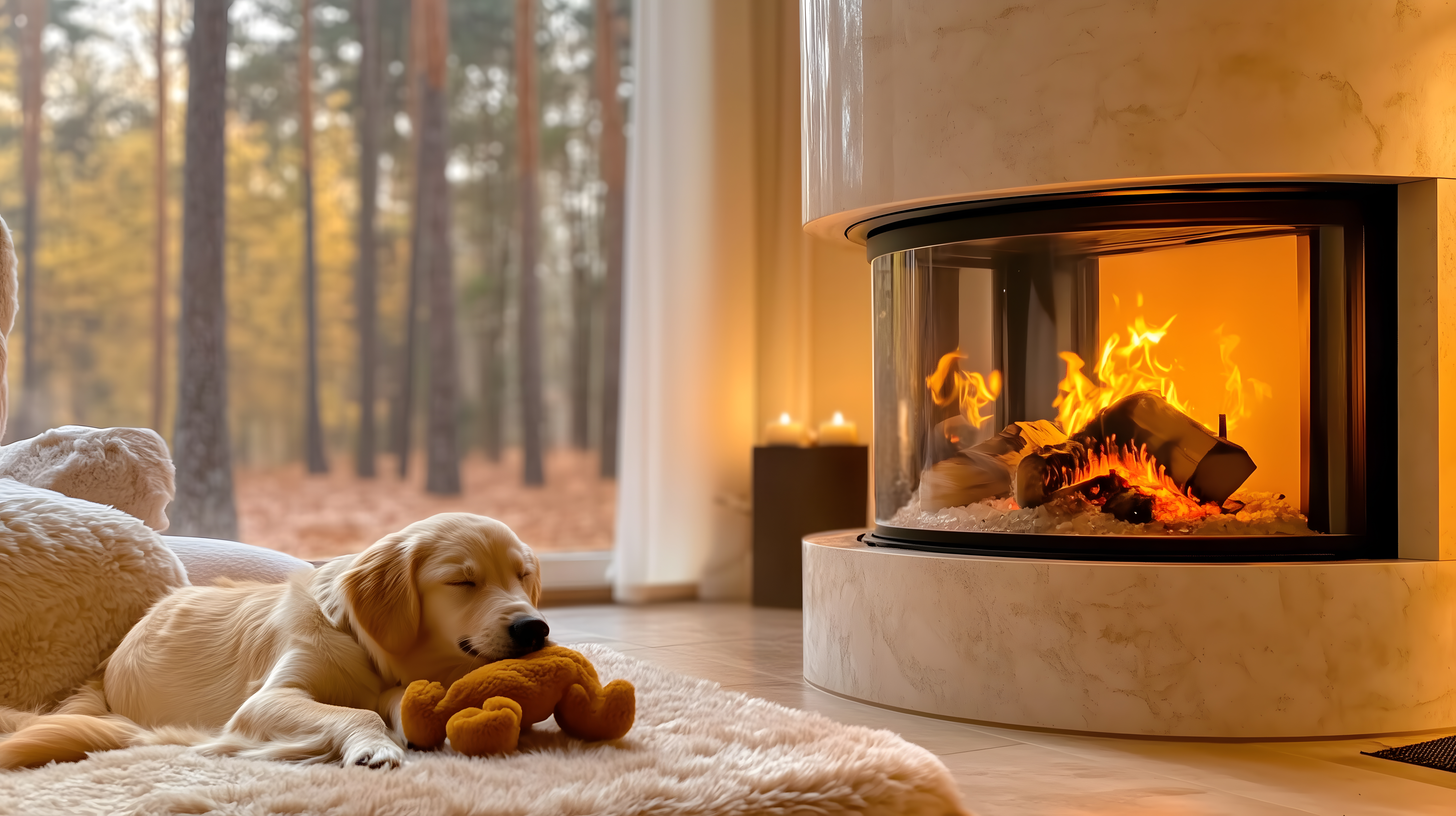 Das Bild zeigt einen goldenen Retriever-Hund, der gemütlich mit einem Teddybären vor einem knisternden Kaminfeuer schläft. Der Hund liegt auf einer weichen, flauschigen Decke in einem Wohnzimmer mit großen Fenstern, die einen Blick in den verschneiten Wald draußen erlauben. Das warme, goldene Licht des Feuers und die kuscheligen Textilien schaffen eine sehr gemütliche und entspannende Atmosphäre. Dieses Foto lässt sich hervorragend für Websites, Blogs oder Social-Media-Beiträge zum Thema Haustiere, Gemütlichkeit oder Winter einsetzen. Es steht als hochwertiges, kostenloses Stockfoto unter einer Creative-Commons-Lizenz zur Verfügung.