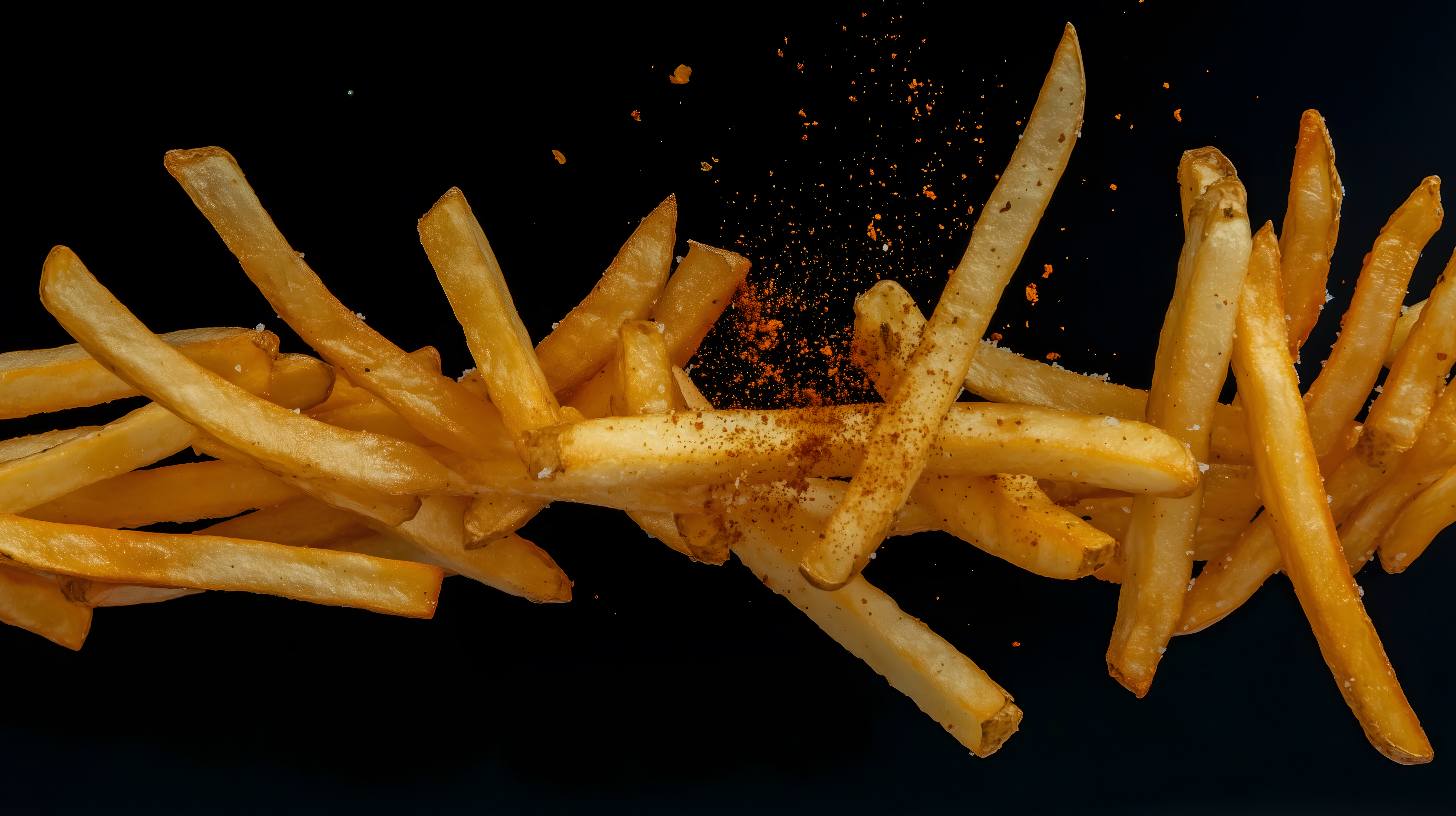 Dieses verlockende Foto zeigt eine Portion knuspriger, goldgelber Pommes Frites, die vor einem dunklen Hintergrund schweben. Die Kartoffelstäbchen sind mit feinen Gewürzen wie Paprika oder Salz bestreut, was ihnen einen appetitlichen Geschmack verleiht. Das Bild hat eine starke Tiefenschärfe und konzentriert sich ganz auf die Hauptmotive, wodurch die Pommes besonders verlockend in Szene gesetzt werden. Dieses hochauflösende Foto eignet sich hervorragend für die Verwendung in Blogs, Social-Media-Kanälen, Werbematerialien oder Kochbüchern rund um das Thema Fastfood und leckere Snacks. Als kostenloses Stockfoto unter Creative-Commons-Lizenz ist es frei nutzbar.