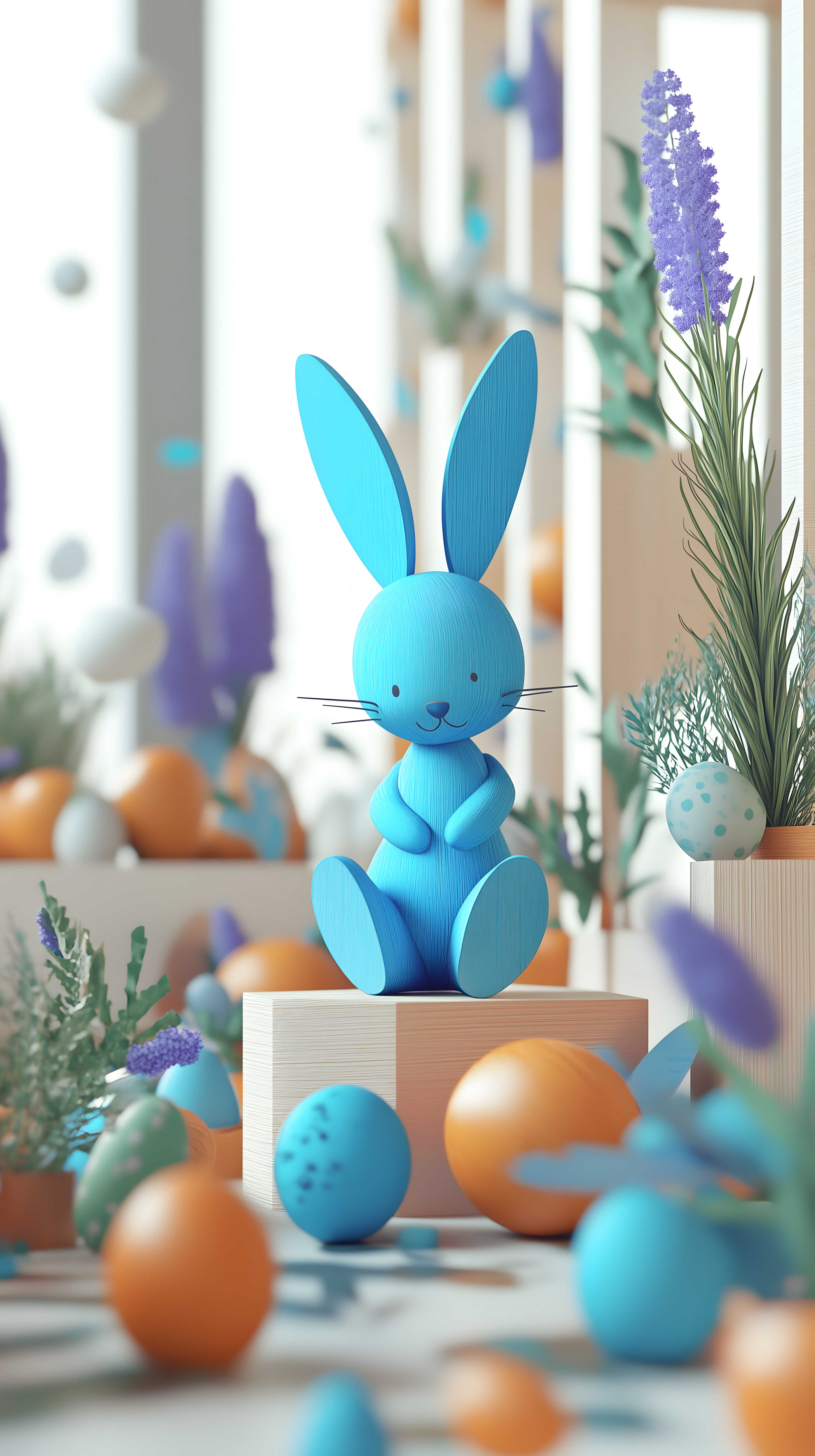 Dieses farbenfrohe Osterbild zeigt einen niedlichen, blauen Osterhasen, der auf einem Holzwürfel sitzt und von bunten Ostereien in verschiedenen Pastelltönen umgeben ist. Im Hintergrund sind Lavendelblüten und andere grüne Pflanzendekoration zu sehen, die eine frühlinghafte und festliche Stimmung vermitteln. Dieses hochwertige Stockfoto eignet sich perfekt für Oster-Dekorationen, Einladungskarten, Grußkarten, Blogbeiträge oder Werbematerialien rund um das Osterfest. Das Bild ist in hoher Auflösung und unter einer Creative-Commons-Lizenz verfügbar.