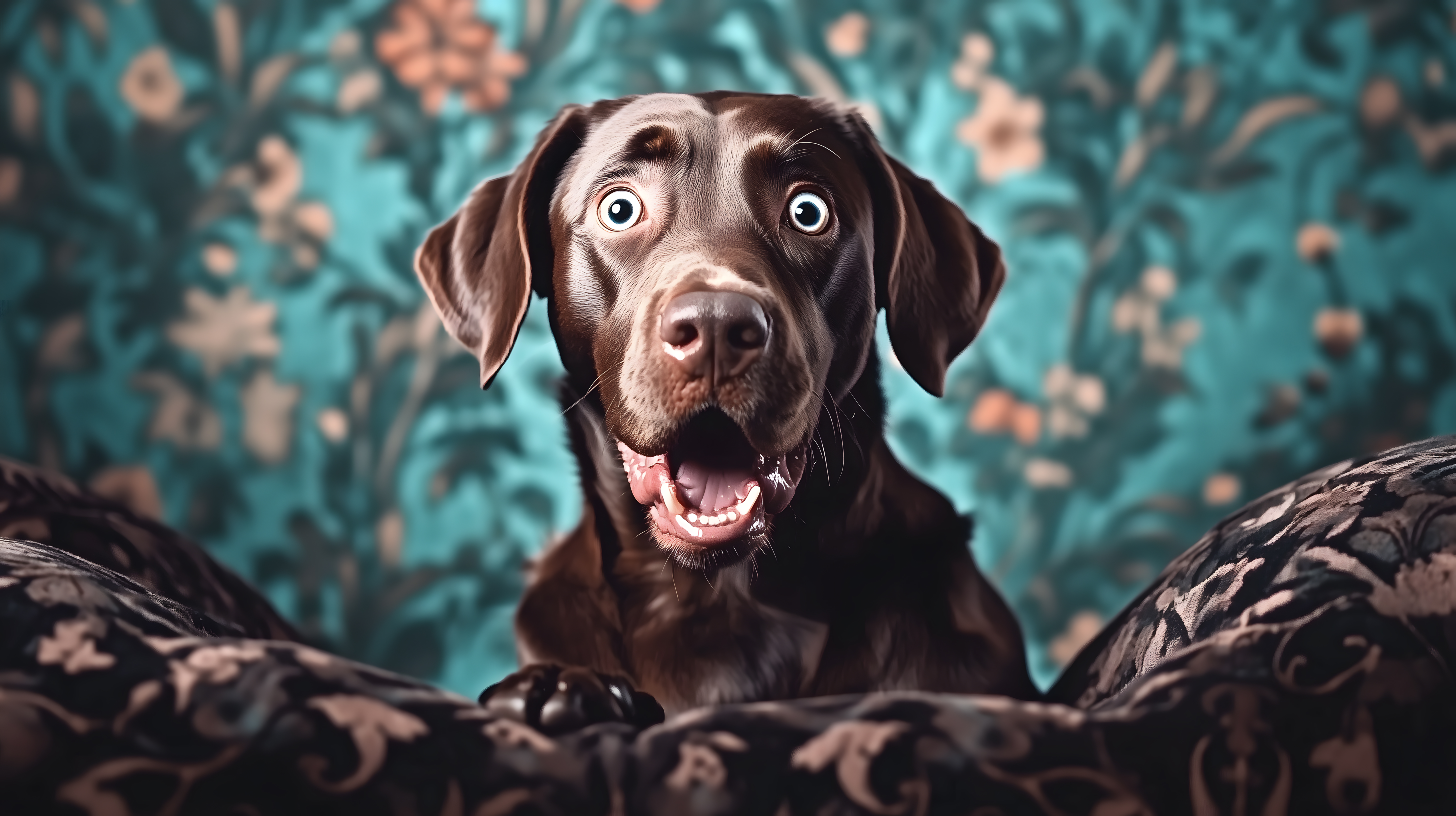 Dieses eindrucksvolle Foto zeigt einen braunen Labrador Retriever Hund, der mit großen Augen und offenem Maul in die Kamera blickt. Der Hund ist vor einem üppigen, bunten Blumenhintergrund platziert, wodurch ein lebendiger und farbenfroher Kontrast entsteht. Die hochauflösende Aufnahme erzeugt eine natürliche, detailreiche Optik und lässt die Emotionen des Hundes klar zum Vorschein kommen. Dieses Stockfoto eignet sich hervorragend für den Einsatz in Blogs, Social-Media-Beiträgen, Werbekampagnen und vielen weiteren kreativen Projekten. Es steht unter einer Creative-Commons-Lizenz zur kostenfreien Nutzung zur Verfügung.