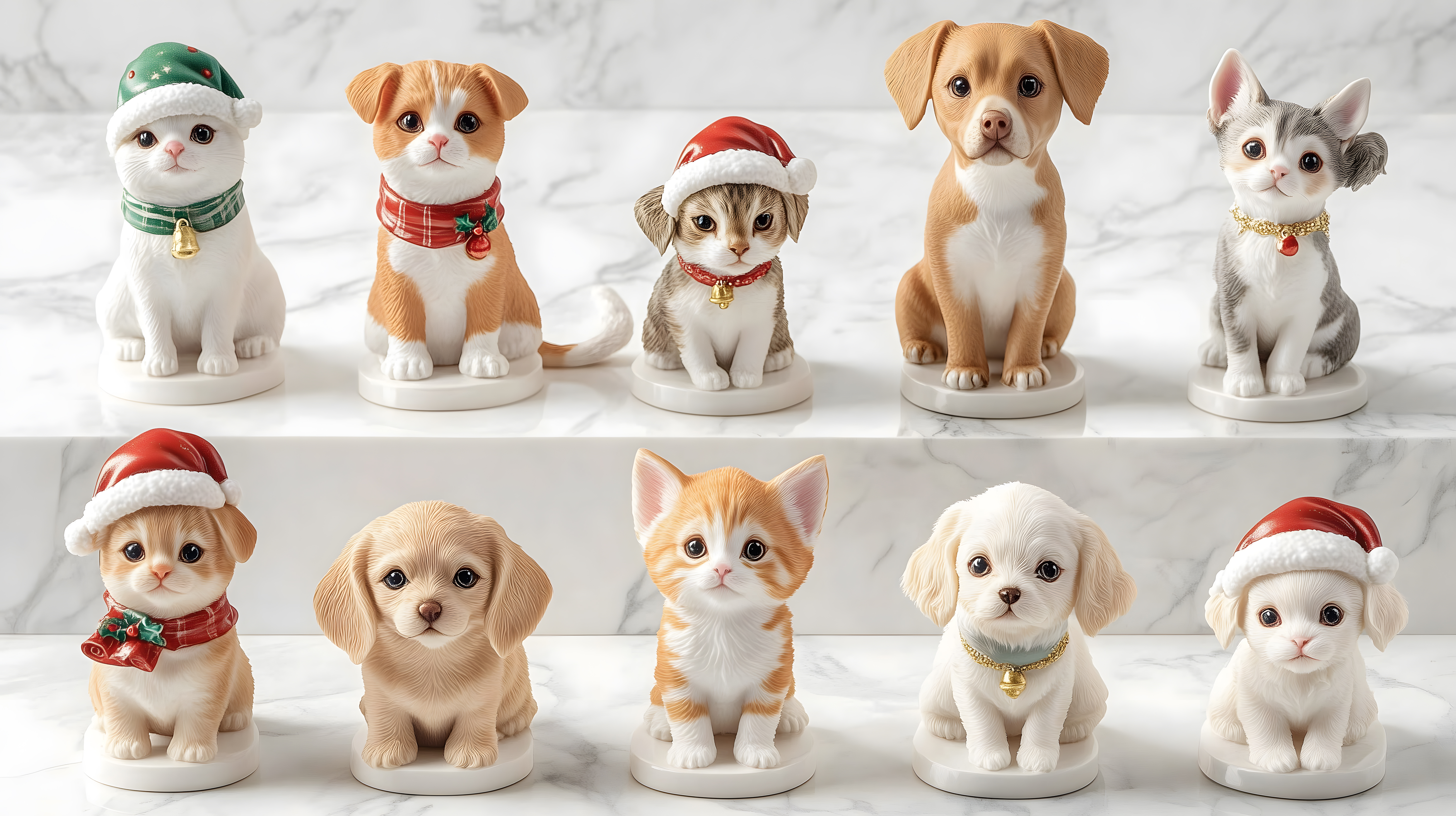 Dieses Foto zeigt eine Reihe von detaillierten Weihnachtsfiguren aus Porzellan oder Keramik in Form von verschiedenen Haustieren - Katzen, Hunde und andere Tiere. Die Figuren tragen Accessoires wie Mützen, Schals und Glocken in typischen Weihnachtsfarben wie Rot, Grün und Weiß. Sie sitzen auf einer weißen Oberfläche, was einen reinen, minimalistischen Hintergrund schafft, um die Figuren in den Mittelpunkt zu rücken. Dieses Motiv eignet sich hervorragend als kostenloses Stockfoto für Weihnachtsgrußkarten, Werbekampagnen oder Social-Media-Inhalte in hoher Auflösung und unter Creative-Commons-Lizenz.