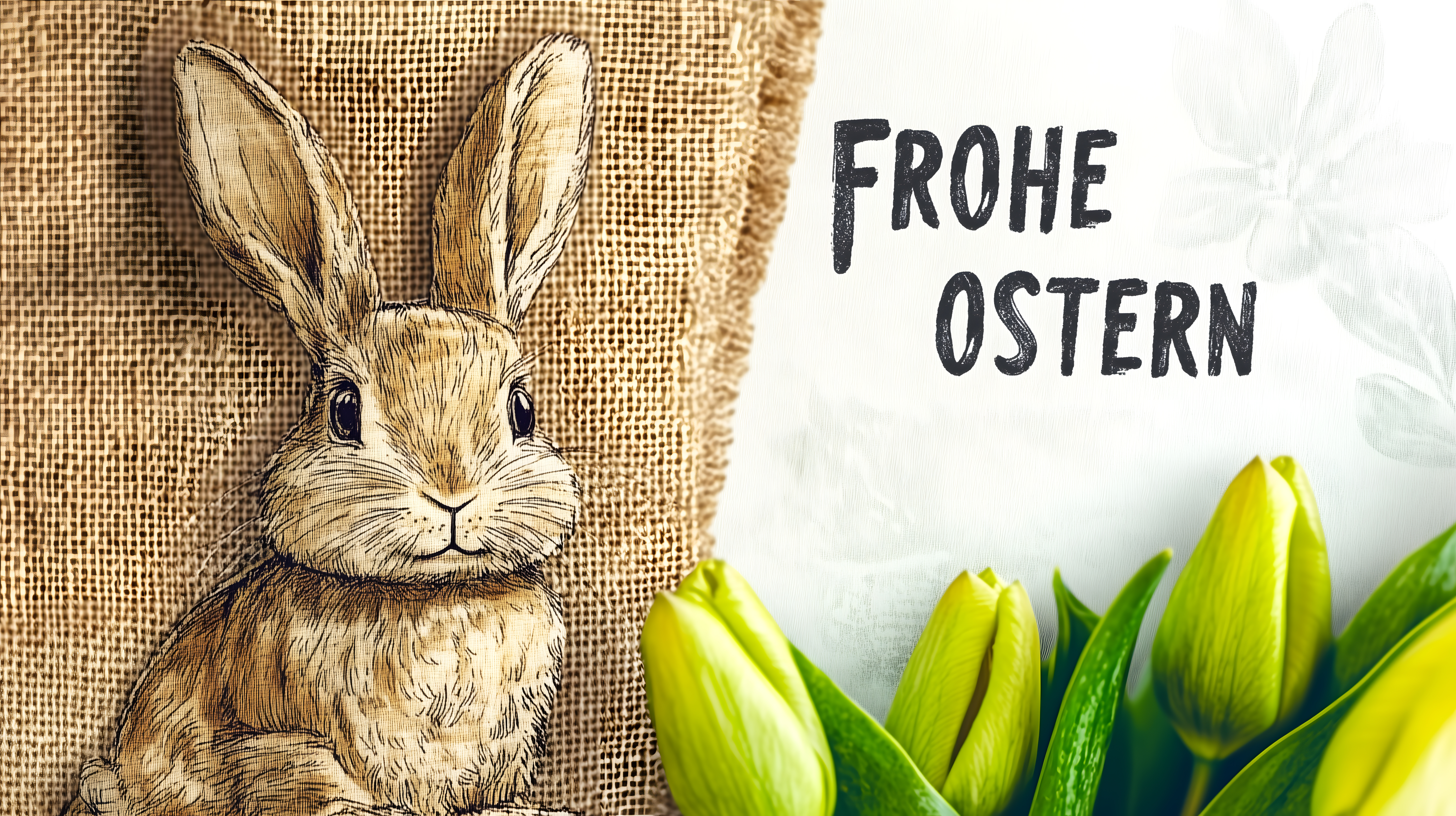 Dieses Stockfoto zeigt einen detaillierten gezeichneten Osterhasen auf einem Sackleinen-Hintergrund. Der Hase sitzt zwischen grünen Tulpenblättern und blickt den Betrachter direkt an. Der Sackleinen-Hintergrund verleiht dem Bild einen rustikalen, natürlichen Look. Dieser freundliche Osterhase eignet sich hervorragend als Motiv für Ostergrußkarten, Blogbeiträge oder Werbematerialien rund um das Osterfest. Das hochauflösende Foto steht unter einer Creative-Commons-Lizenz zum kostenlosen Download zur Verfügung.