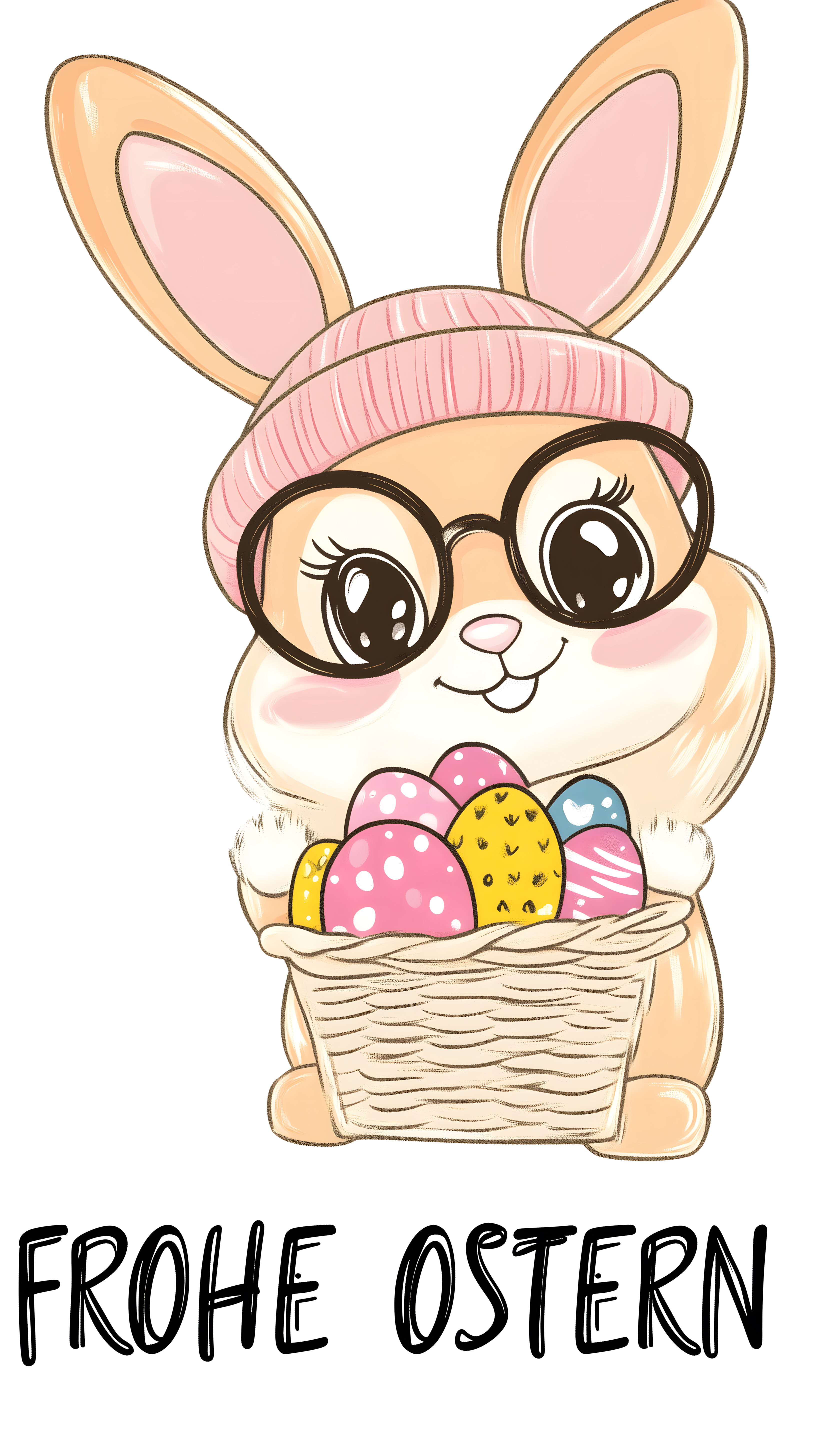 Das Bild zeigt einen fröhlichen, animierten Osterhasen-Charakter, der einen Korb voller bunter Ostereier trägt. Er hat große, spitze Ohren, trägt eine rosa Mütze und eine Brille mit großen Augen. Der Osterhase wirkt sehr niedlich und spaßig, perfekt als Eyecatcher für Osterdekorationen, Grußkarten oder Werbematerialien rund um das Osterfest. Das hochwertige Vektorgrafikformat eignet sich für den kostenlosen Download und die Verwendung in hoher Auflösung unter Creative-Commons-Lizenz.