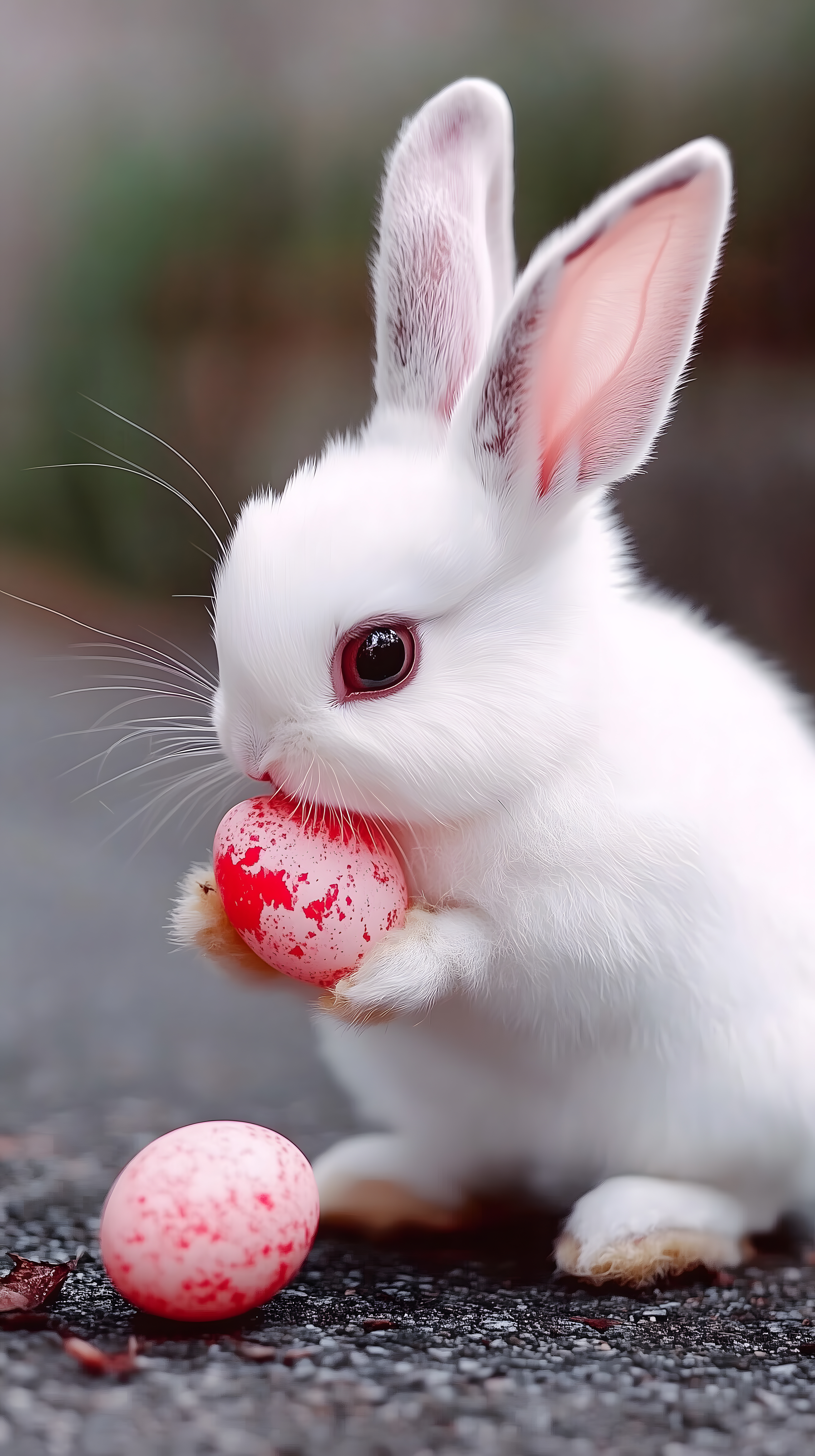 Das Bild zeigt ein niedliches weißes Osterkaninchen, das ein rotes Osterei in seinen Vorderpfoten hält. Das Kaninchen blickt direkt in die Kamera mit seinen dunklen Augen und einem feinen rosa Nasenrüssel. Das Bild hat eine klare Schärfe und Fokussierung auf das Tier, während der Hintergrund mit Asphalt eine einfache, strukturierte Textur bildet. Dieses Motiv eignet sich hervorragend als Stockfoto für Osterdekorationen, Frühlingskampagnen oder auch Illustrationen in Artikeln rund um das Thema Ostern. Das hochauflösende Bild ist unter einer Creative-Commons-Lizenz frei verfügbar.