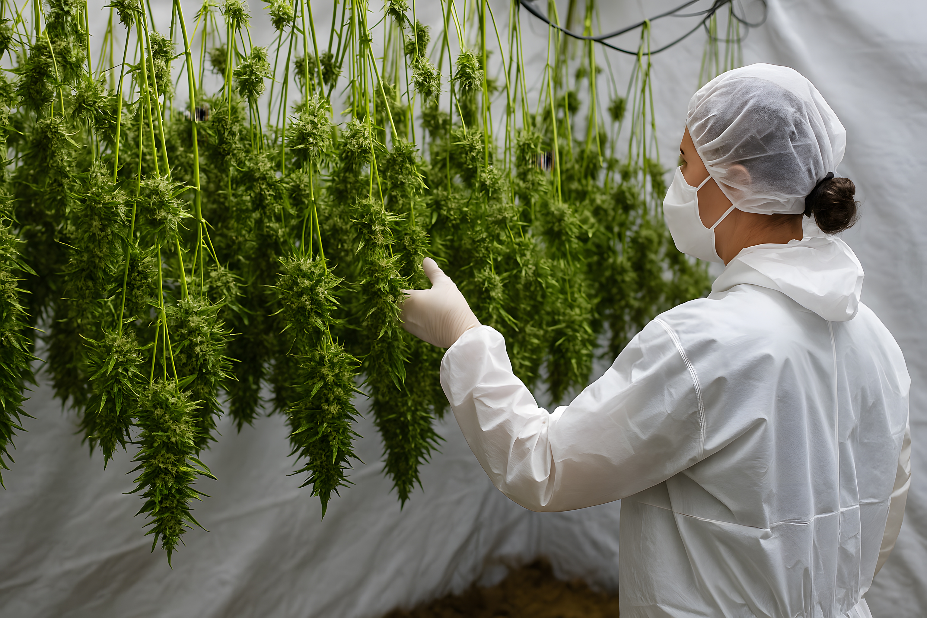 Das Bild zeigt eine professionelle Indoor-Plantage mit üppig wachsenden Hanfpflanzen. Eine Person in Schutzkleidung und Handschuhen steht zwischen den dicht hängenden, grünen Pflanzen und überprüft die Ernte. Die Szene vermittelt den Eindruck eines sauberen, kontrollierten Arbeitsumfelds, in dem Medizinal-Cannabis oder Industriehanf für verschiedene Zwecke produziert wird. Das hochauflösende Foto eignet sich hervorragend für die Verwendung in Blogs, Newslettern oder Social-Media-Posts rund um Themen wie Landwirtschaft, Gesundheit, Nachhaltigkeit und Naturmedizin. Als kostenloses Stockfoto unter Creative-Commons-Lizenz lässt es sich vielfältig einsetzen.