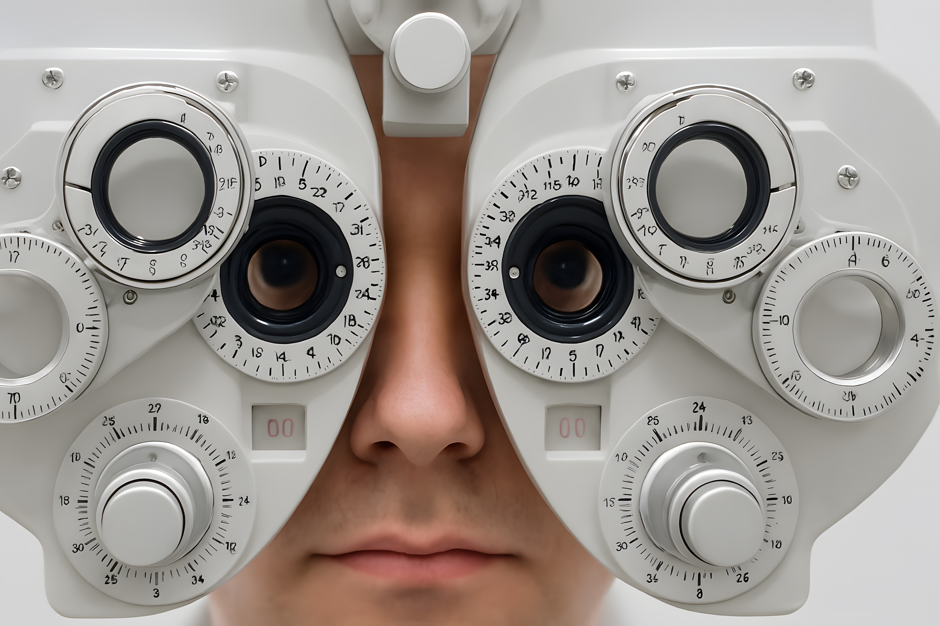 Das Bild zeigt einen Nahaufnahme-Ausschnitt eines Gesichts, bei dem der Blick auf ein modernes Sehtest-Gerät gerichtet ist. Das Gerät besteht aus zwei kreisförmigen Anzeigen mit numerischen Skalen, die für die Durchführung von Sehfähigkeitstests in einer Augenarztpraxis verwendet werden. Das Bild vermittelt den Eindruck von Präzision, Konzentration und einer professionellen medizinischen Untersuchung. Es eignet sich hervorragend als kostenloses Stockfoto für Beiträge rund um Themen wie Augengesundheit, Optometrie, Medizintechnik oder Gesundheitsversorgung - in hoher Auflösung und unter Creative-Commons-Lizenz.