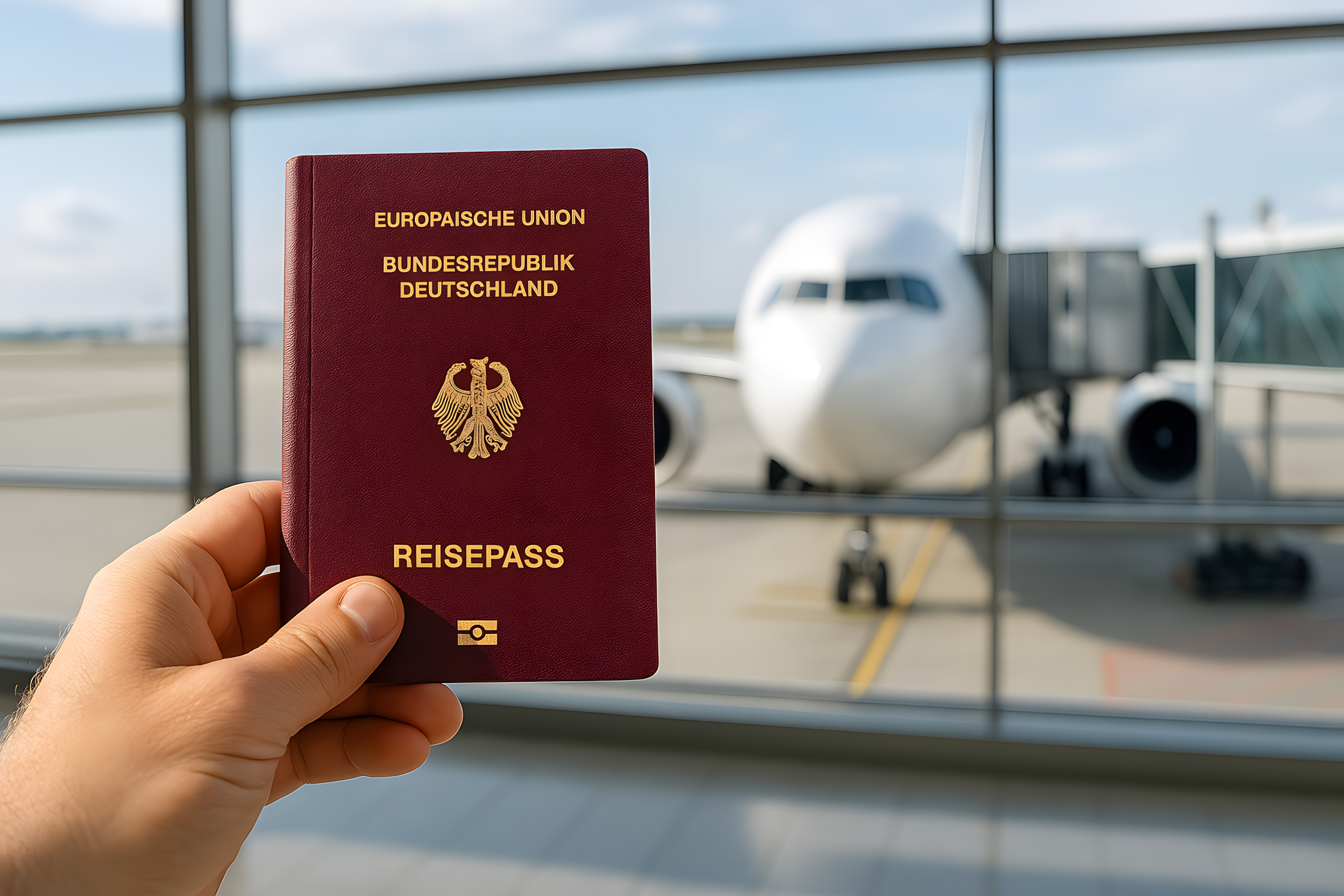 Das Bild zeigt einen deutschen Reisepass, der von einer Hand vor einem großen Fenster mit Blick auf ein Flugzeug am Flughafen gehalten wird. Der rote Reisepass mit dem deutschen Adler auf dem Cover ist ein typisches Identitätsdokument für Reisen innerhalb der Europäischen Union. Das Fenster und das Flugzeug im Hintergrund deuten auf eine Flughafenumgebung hin, was den Kontext des Reisens und des Reisepasses unterstreicht. Dieses Stockfoto eignet sich hervorragend für Blogs, Newsletter, Social-Media-Beiträge oder Werbematerialien rund um das Thema Reisen, Tourismus und Identitätsdokumente. Das Foto ist in hoher Auflösung verfügbar und steht unter einer Creative-Commons-Lizenz zur Verfügung.