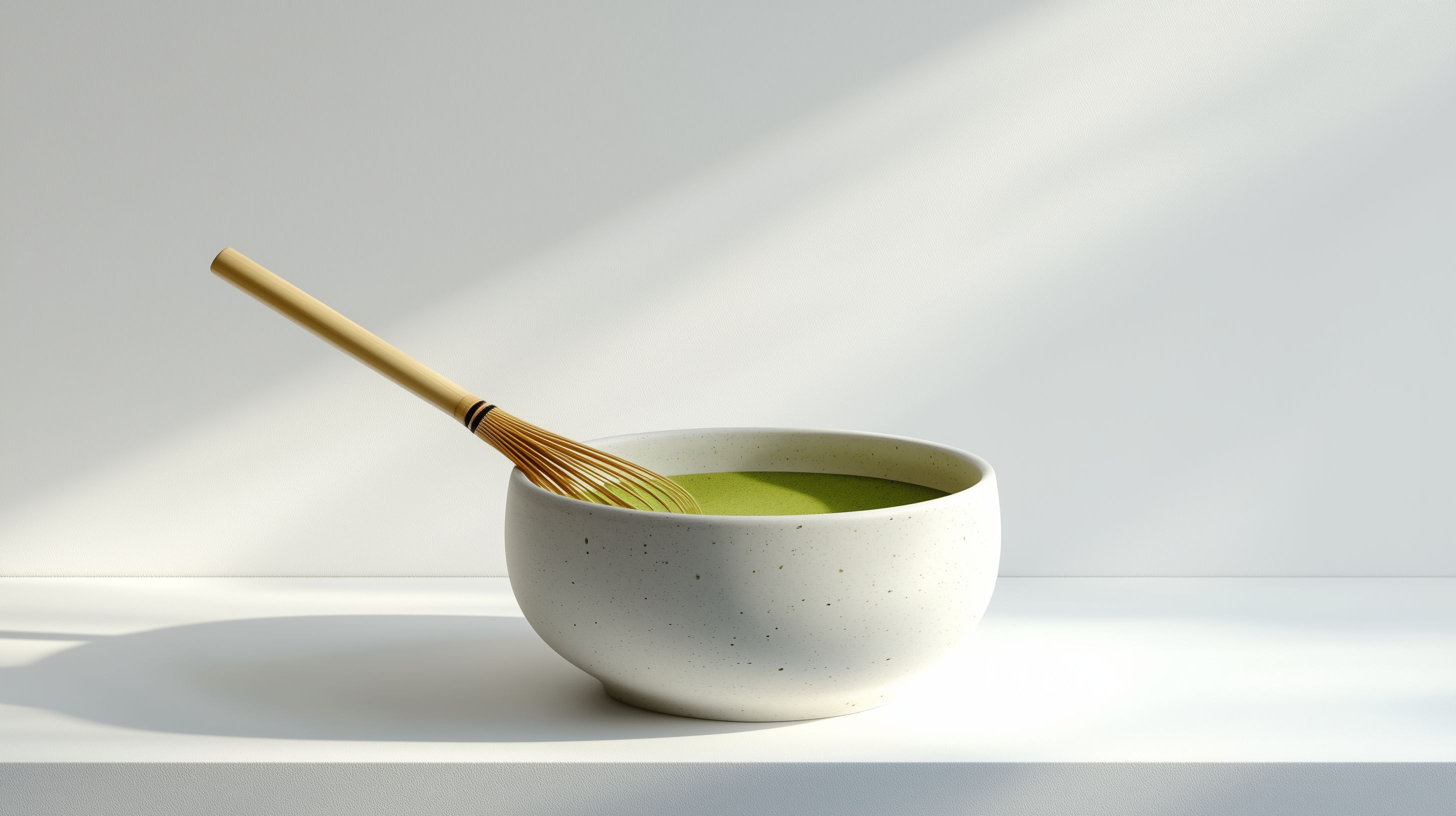 Das Bild zeigt eine Szene der traditionellen japanischen Matcha-Tee-Zubereitung. Eine schlicht gestaltete, weiße Keramikschale enthält den leuchtend grünen Matcha-Tee, der mit einem speziellen Bambusquirl, dem Chasen, geschäumt wird. Die Komposition ist minimalistisch und fokussiert sich ganz auf das Wesentliche - die Zubereitung und Präsentation des hochwertigen Tees. Dieses Stockfoto eignet sich hervorragend für Blog-Beiträge, Newsletter oder Social-Media-Postings rund um Themen wie Tee, Wellness, Lifestyle oder japanische Kultur. Die hohe Auflösung und Creative-Commons-Lizenz ermöglichen eine flexible Nutzung des Motivs.