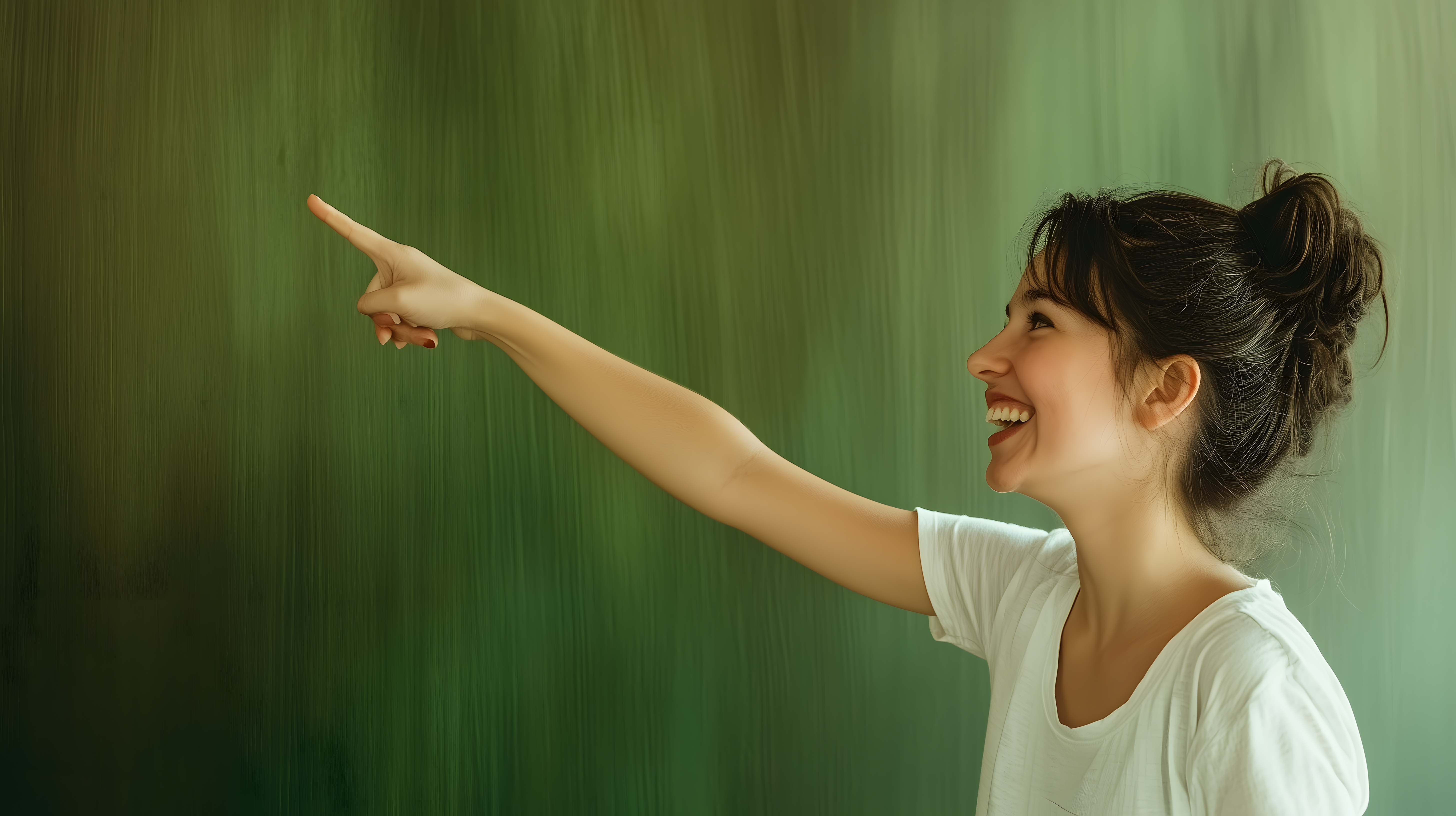 Das Foto zeigt eine lächelnde Frau, die fröhlich mit ausgestrecktem Arm nach oben zeigt. Sie steht vor einem grünen, verschwommenen Hintergrund, der ihre Bewegung und Energie betont. Das Bild strahlt positive Stimmung, Lebensfreude und Optimismus aus. Es könnte für verschiedene Zwecke eingesetzt werden, etwa in Blogbeiträgen, Werbekampagnen oder sozialen Medien, um Gefühle wie Motivation, Entdeckerlust oder Inspiration zu vermitteln. Als hochwertiges Stockfoto in hoher Auflösung und unter Creative-Commons-Lizenz ist es frei nutzbar.