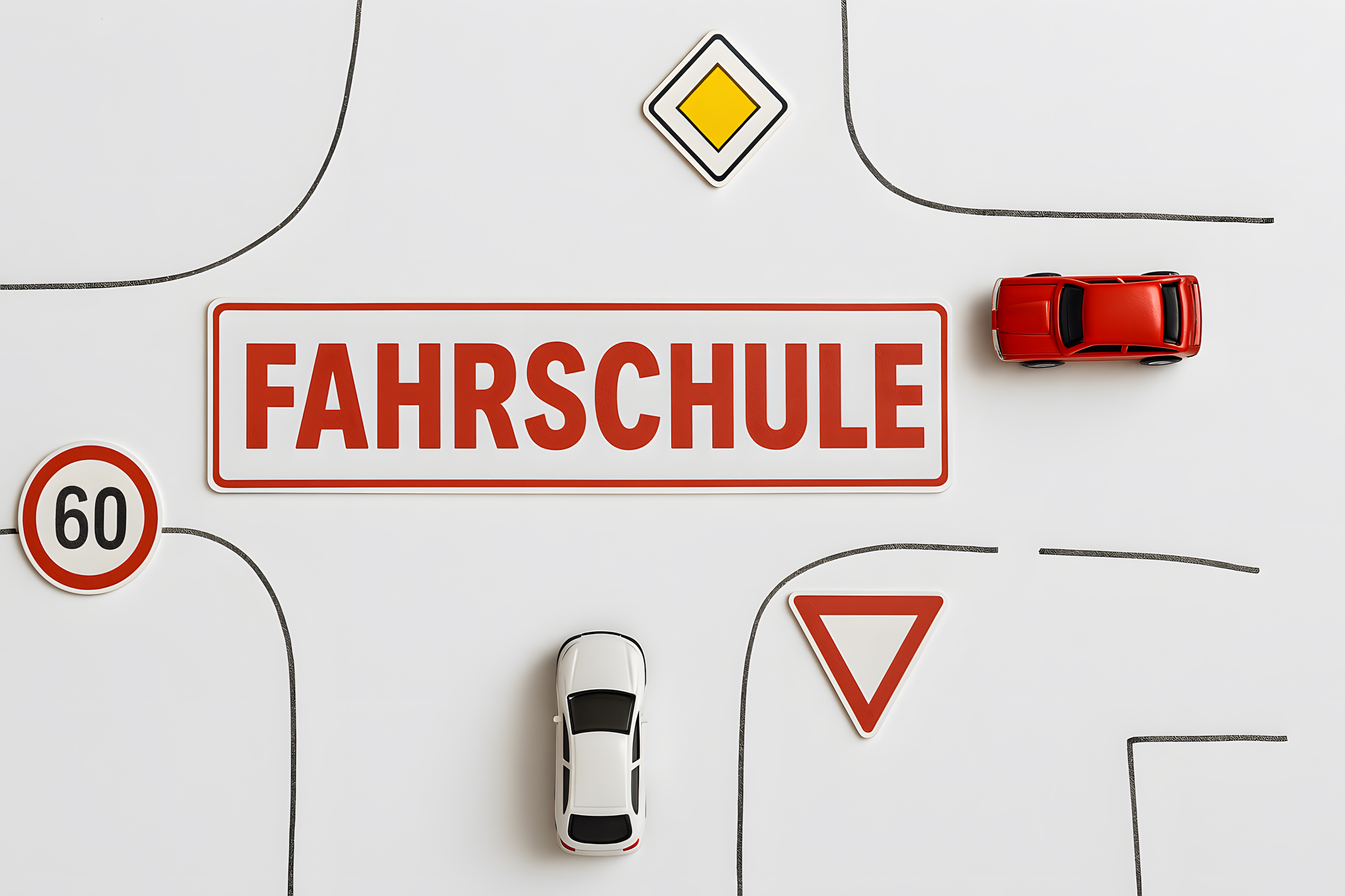 Das Bild zeigt verschiedene Verkehrszeichen und Spielzeugautos, die typisch für eine Fahrschule sind. Im Zentrum befindet sich ein großes, rotes Schild mit der Aufschrift 'FAHRSCHULE', umgeben von einem Geschwindigkeitsschild mit der Zahl '60', einem Vorfahrtszeichen und einem gelben Diamantenschild. Daneben sind zwei Spielzeugautos, die die praktische Fahrausbildung symbolisieren. Das Bild vermittelt einen Eindruck von der Vorbereitung auf die Führerscheinprüfung und den theoretischen sowie praktischen Teil der Fahrerausbildung. Es eignet sich hervorragend als kostenloses Stockfoto für Blogs, Social-Media-Beiträge oder Werbematerialien rund um das Thema Verkehrssicherheit, Führerscheinausbildung und Mobilität. Die hochauflösende Datei ist unter einer Creative-Commons-Lizenz frei verwendbar.