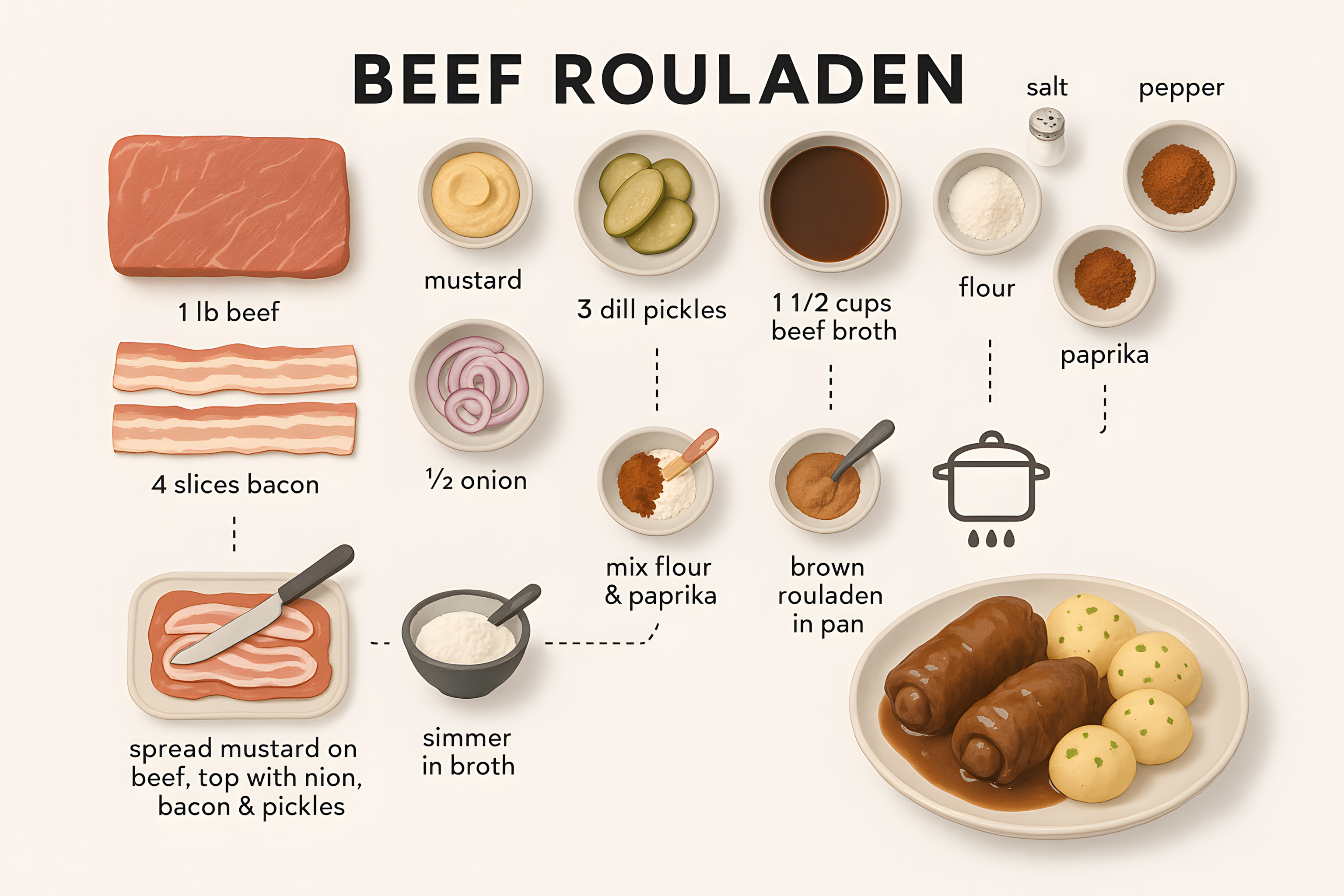 Dieses anschauliche Foto zeigt die Zutaten und Zubereitungsschritte für ein leckeres Rindfleisch-Rouladen-Gericht. Im Vordergrund sind die Hauptzutaten wie Rindfleisch, Speck, Zwiebeln und Gewürze sorgfältig arrangiert. Im Hintergrund sind weitere Zutaten wie Brühe, Mehl und Paprikapulver zu sehen, die für die Zubereitung der Soße verwendet werden. Das fertige Gericht mit den goldbraunen Rouladen und den Kartoffelknödeln wird am rechten Rand präsentiert.