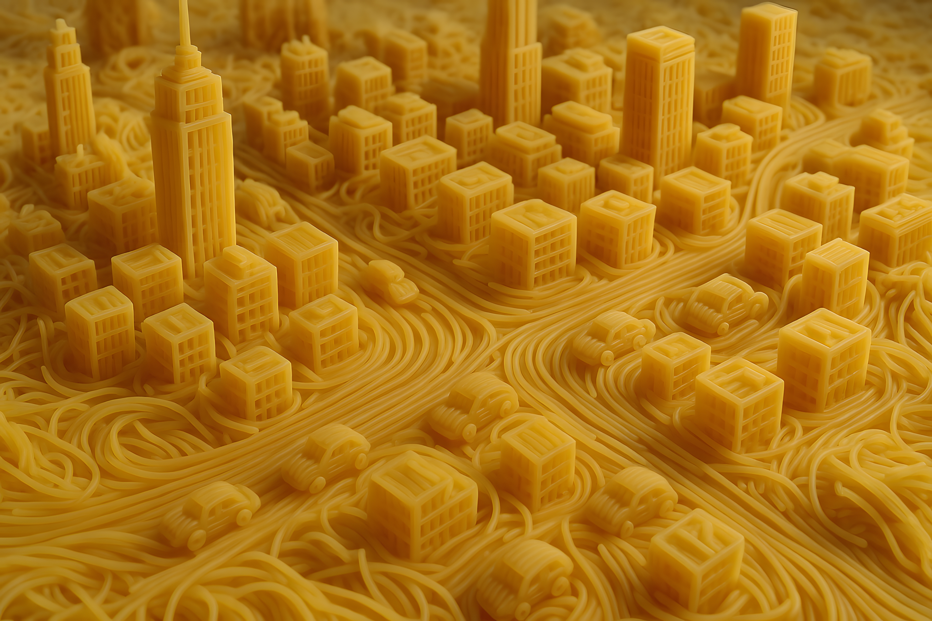 Dieses faszinierende Bild zeigt eine Stadtlandschaft, die vollständig aus Nudelgebäck wie Spaghetti und kleinen Würfeln gefertigt ist. Die Perspektive ist stark verzerrt, sodass die Hochhäuser und Straßen wie eine surreale, abstrakte Komposition wirken. Die gelbe Farbgebung verleiht der Szene eine warme, fast schon künstlerische Anmutung. Dieses einzigartige Stockfoto eignet sich perfekt für Beiträge in Magazinen, Blogs oder sozialen Medien rund um Essen, Kochen und kreative Fotografie. Es ist in hoher Auflösung und unter einer Creative-Commons-Lizenz verfügbar.