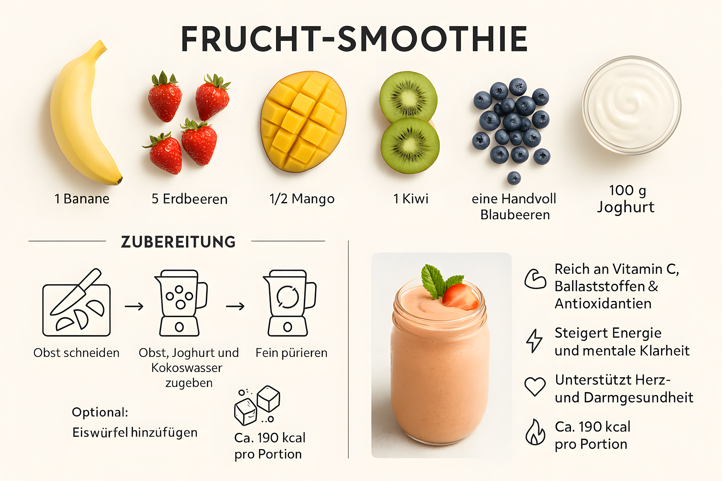 Dieses Foto zeigt ein köstliches und gesundes Rezept für einen fruchtigen Smoothie. Im Mittelpunkt steht ein Einmachglas gefüllt mit einer cremigen, pfirsichfarbenen Smoothie-Komposition, umgeben von den frischen Zutaten wie Banane, Erdbeeren, Blaubeeren, Kiwi und Mango. Die ansprechende Anordnung und der warme, natürliche Hintergrund lassen den Smoothie appetitlich und verlockend erscheinen. Dieses Foto wäre ideal für Beiträge in Lifestyle-Blogs, Ernährungs-Websites oder als Eye-Catcher in sozialen Medien rund um gesunde Ernährung und Fitness. Als kostenloses Stockfoto in hoher Auflösung und unter einer Creative-Commons-Lizenz verfügbar, lässt es sich vielseitig und unkompliziert einsetzen.