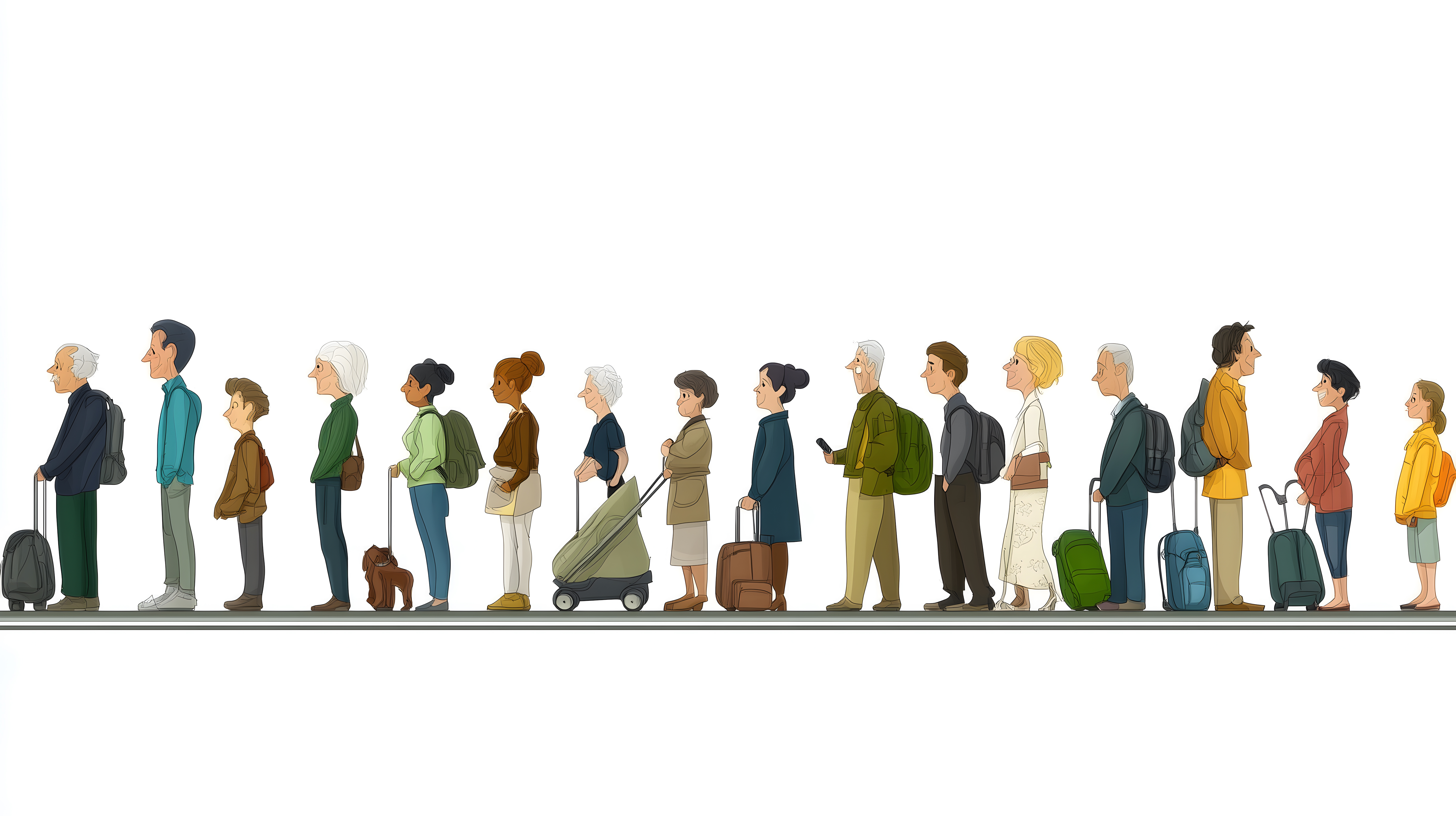 Diese farbenfrohe, stilisierte Illustration zeigt eine Gruppe von Menschen in einer Warteschlange am Bahnhof. Die Menschenmenge ist divers und umfasst Personen verschiedener Altersgruppen, Bekleidungsstile und Gepäckstücke wie Koffer und Rucksäcke. Die Darstellung hat einen Cartoon-Charakter und bietet eine lebendige, horizontale Komposition. Dieses hochauflösende, kostenlose Stockfoto in Creative-Commons-Lizenz eignet sich hervorragend für den Einsatz auf Reisewebseiten, in Werbeanzeigen für Verkehrsmittel oder als Illustration in Blog-Beiträgen rund um das Thema Mobilität und öffentlicher Verkehr.
