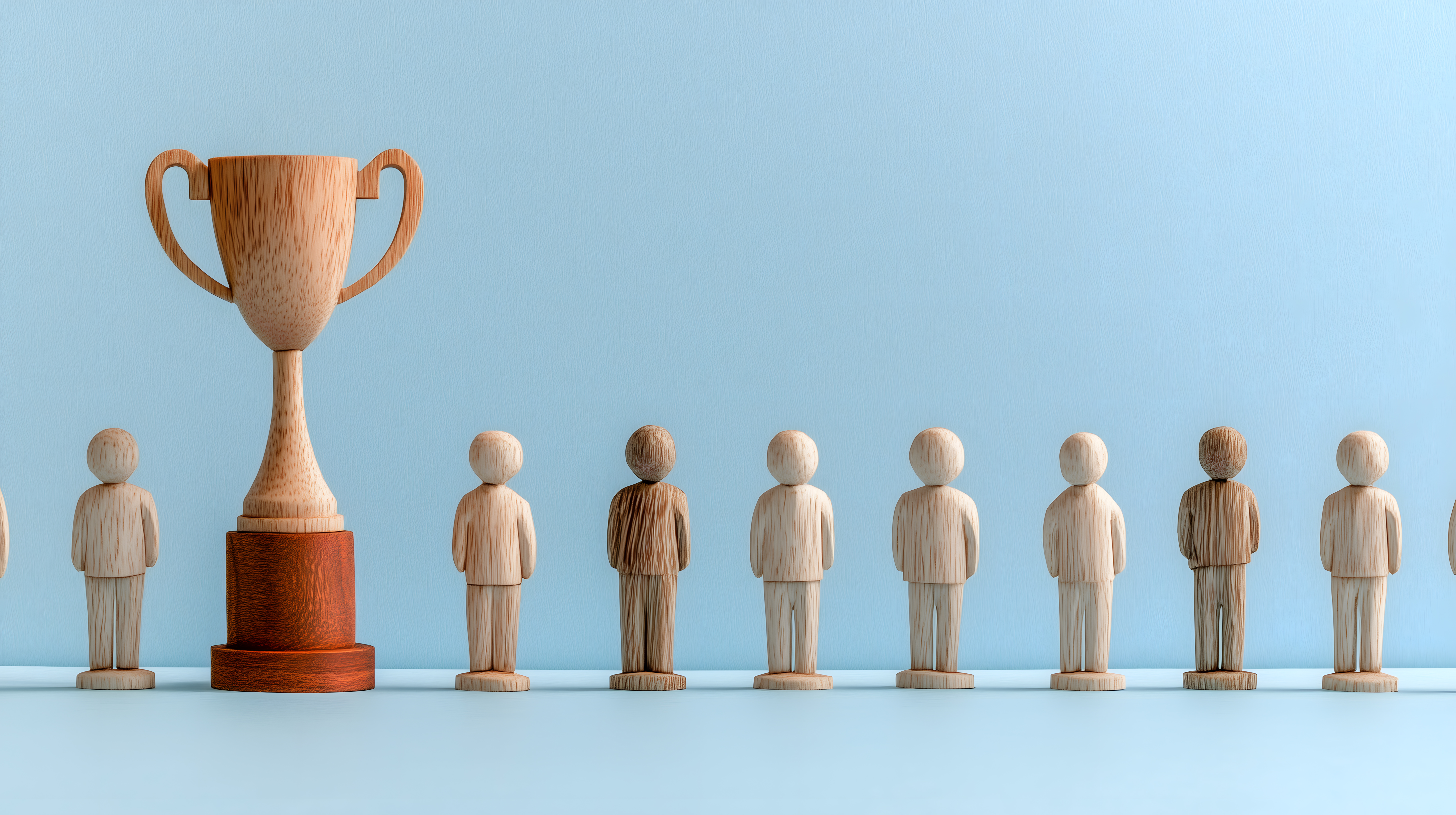 Dieses Bild zeigt eine Gruppe von schlicht gestalteten Holzfiguren, die vor einem hellblauen Hintergrund angeordnet sind. In der Mitte steht ein größerer, holzfarbener Pokal, der als Siegerpokal oder Auszeichnung dienen könnte. Die Figuren stehen in Reih und Glied, was einen Eindruck von Teamwork, Wettbewerb und Erfolg vermittelt. Das Bild eignet sich hervorragend als Illustr ation für Konzepte wie Führung, Kreativität, Unternehmenserfolg oder Motivation. Als kostenloses Stockfoto in hoher Auflösung und unter Creative-Commons-Lizenz kann es in vielen Kontexten eingesetzt werden, beispielsweise in Blogs, Newslettern, Werbekampagnen oder auf Social-Media-Kanälen.