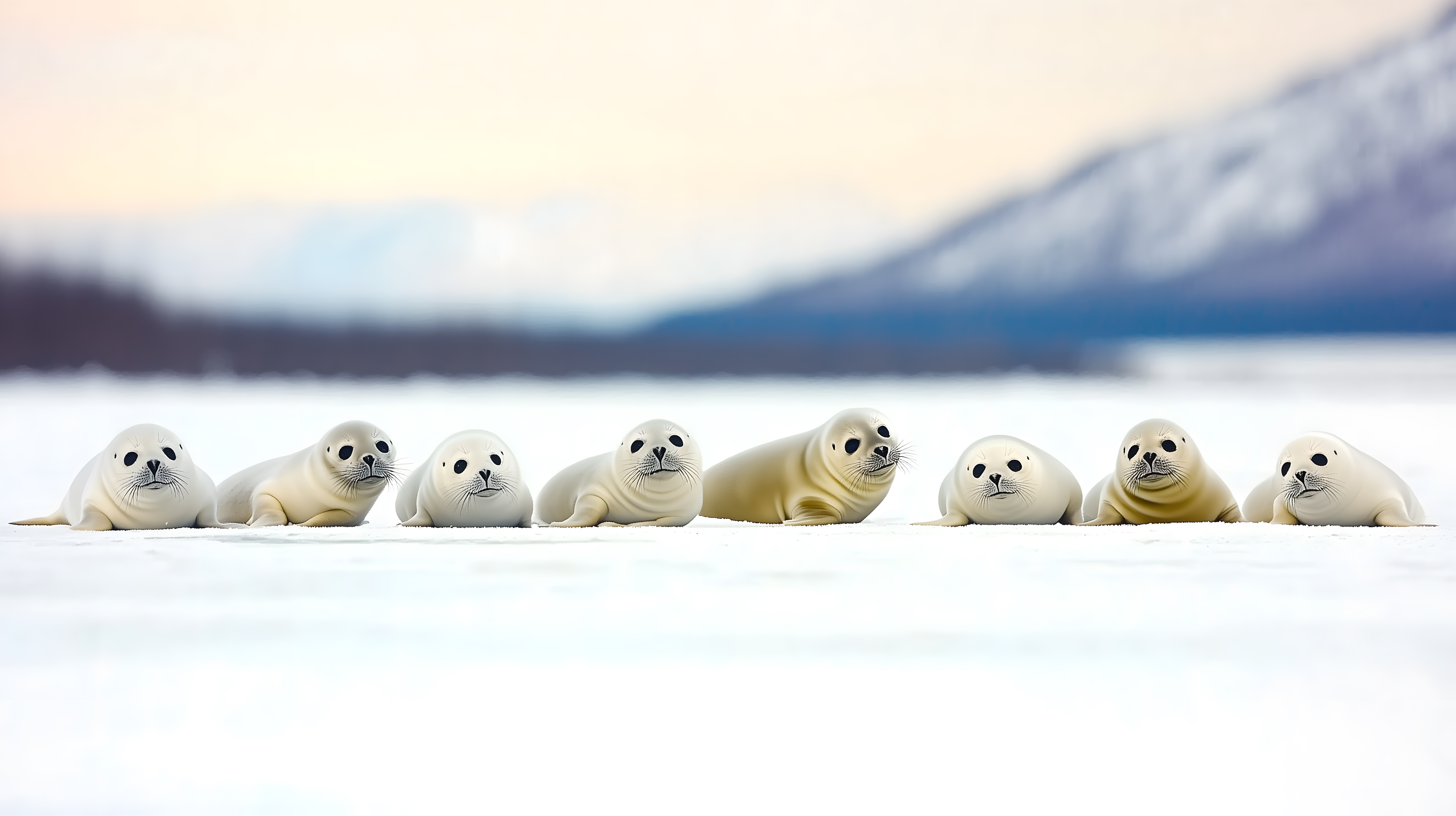 Dieses beeindruckende Foto zeigt eine Gruppe junger Robben, die friedlich auf dem Schnee an der Küste der Arktis liegen. Die Tiere sind in einer entspannten, sorgenlosen Haltung dargestellt, was einen besonderen Einblick in ihr natürliches Verhalten gibt. Mit ihren schönen, runden Gesichtern und den großen, dunklen Augen wirken die Robben sehr liebenswert und fotogen.