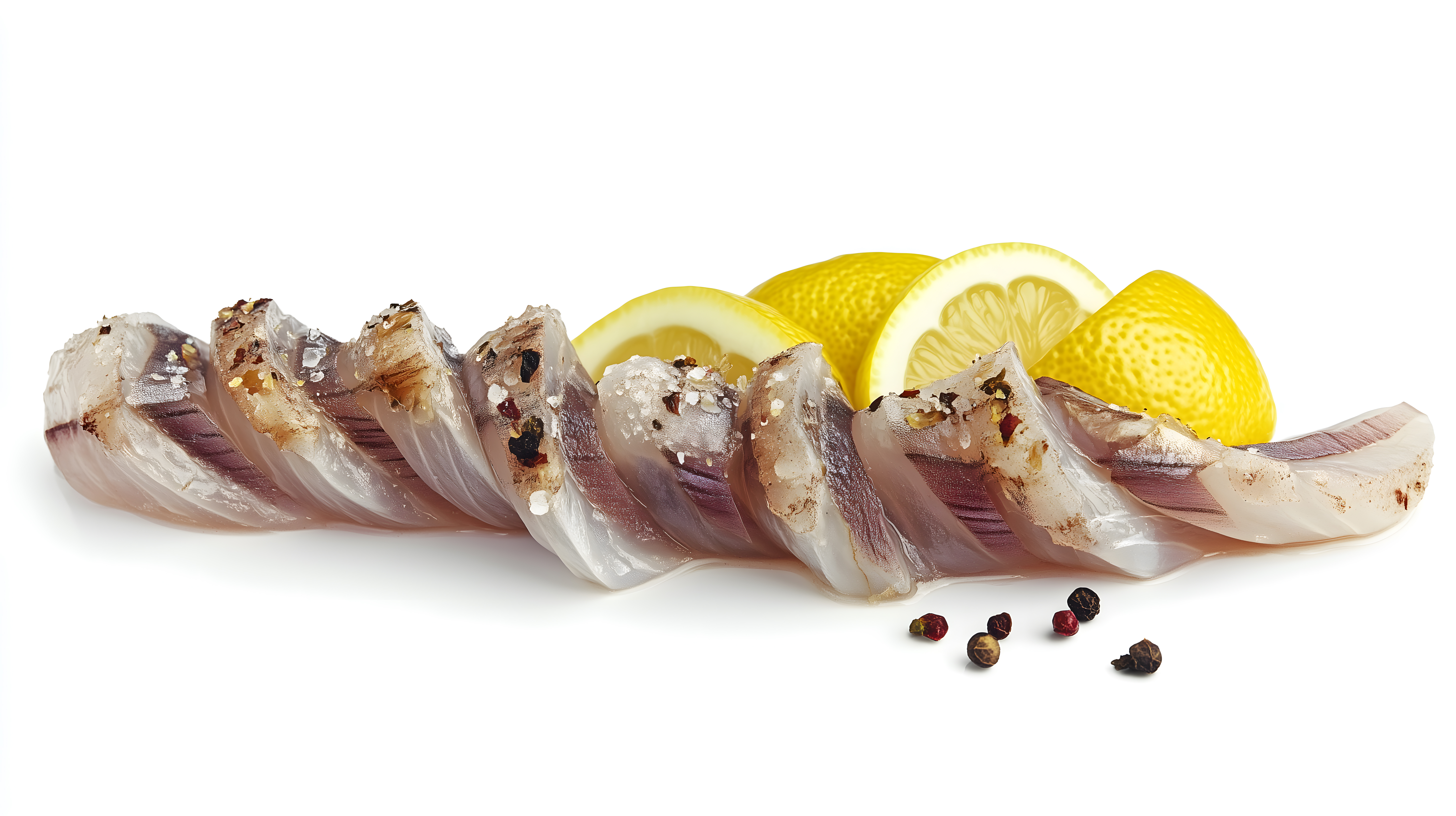 Dieses Foto zeigt geschnittenen Salzhering, garniert mit Zitronenscheiben und Gewürzen. Der Fisch liegt auf einem weißen Hintergrund und ist in einer natürlichen, appetitlichen Anordnung präsentiert. Die Kombination der kontrastreichen Farben und die scharfe Fokussierung machen dieses Bild zu einem idealen Stockfoto für Rezepte, Kochbücher, Lebensmittelwerbung oder kulinarische Blogs. Das hochauflösende Foto ist unter einer Creative-Commons-Lizenz frei nutzbar.
