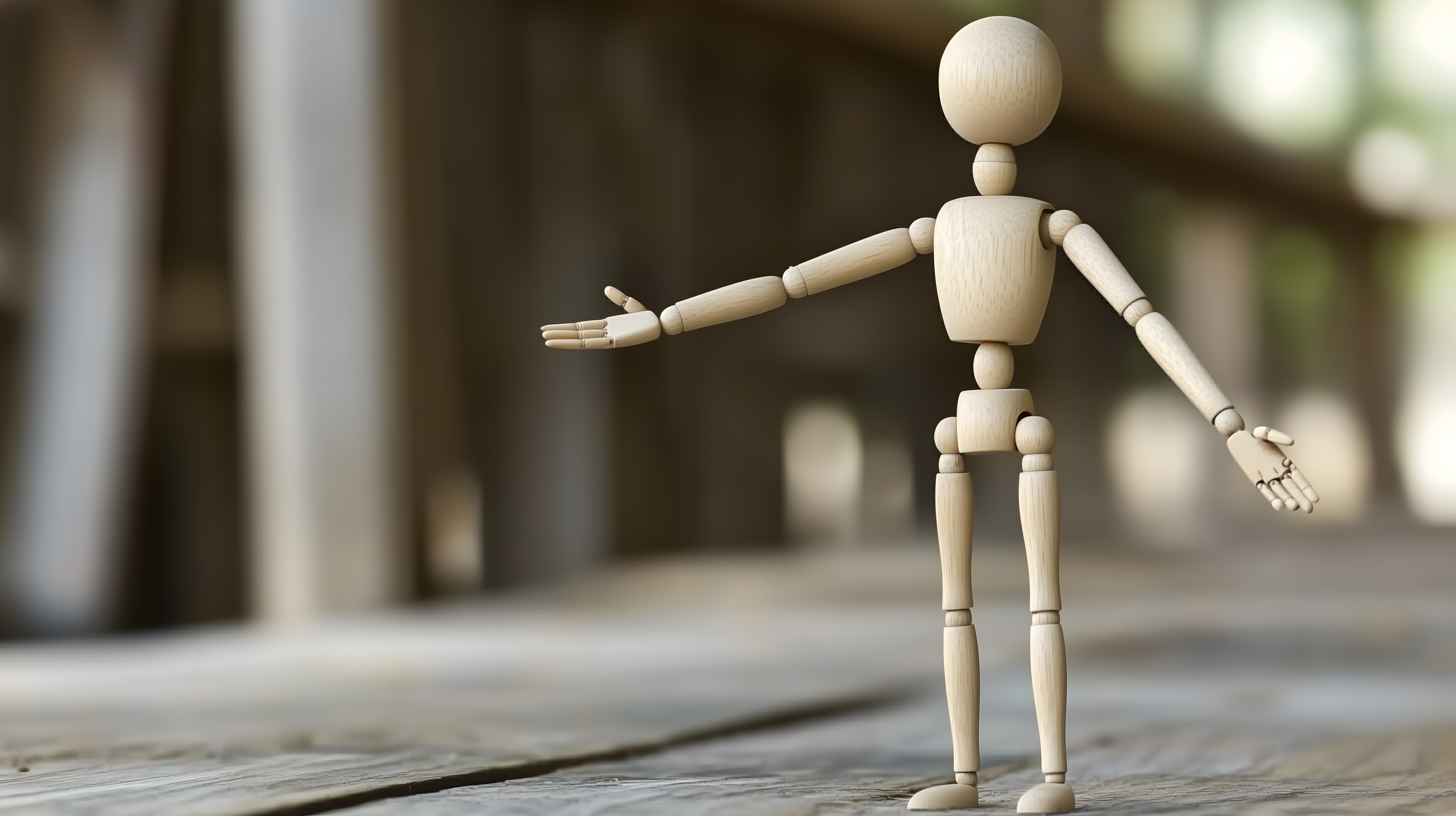 Das Foto zeigt eine hölzerne Zeichenfigur, die in einer ruhigen und meditativen Pose auf einem Holzboden steht. Die Figur hat einen einfachen, minimalistischen Stil und ist in neutralen Farbtönen wie Beige und Grau gehalten. Die Komposition ist klar und fokussiert, mit dem Hauptmotiv in der Mitte des Bildes. Diese Darstellung vermittelt ein Gefühl der Ruhe, Entspannung und Konzentration. Das Foto eignet sich hervorragend als kostenloses Stockfoto für kreative und konzeptionelle Projekte in hoher Auflösung und unter einer Creative-Commons-Lizenz.