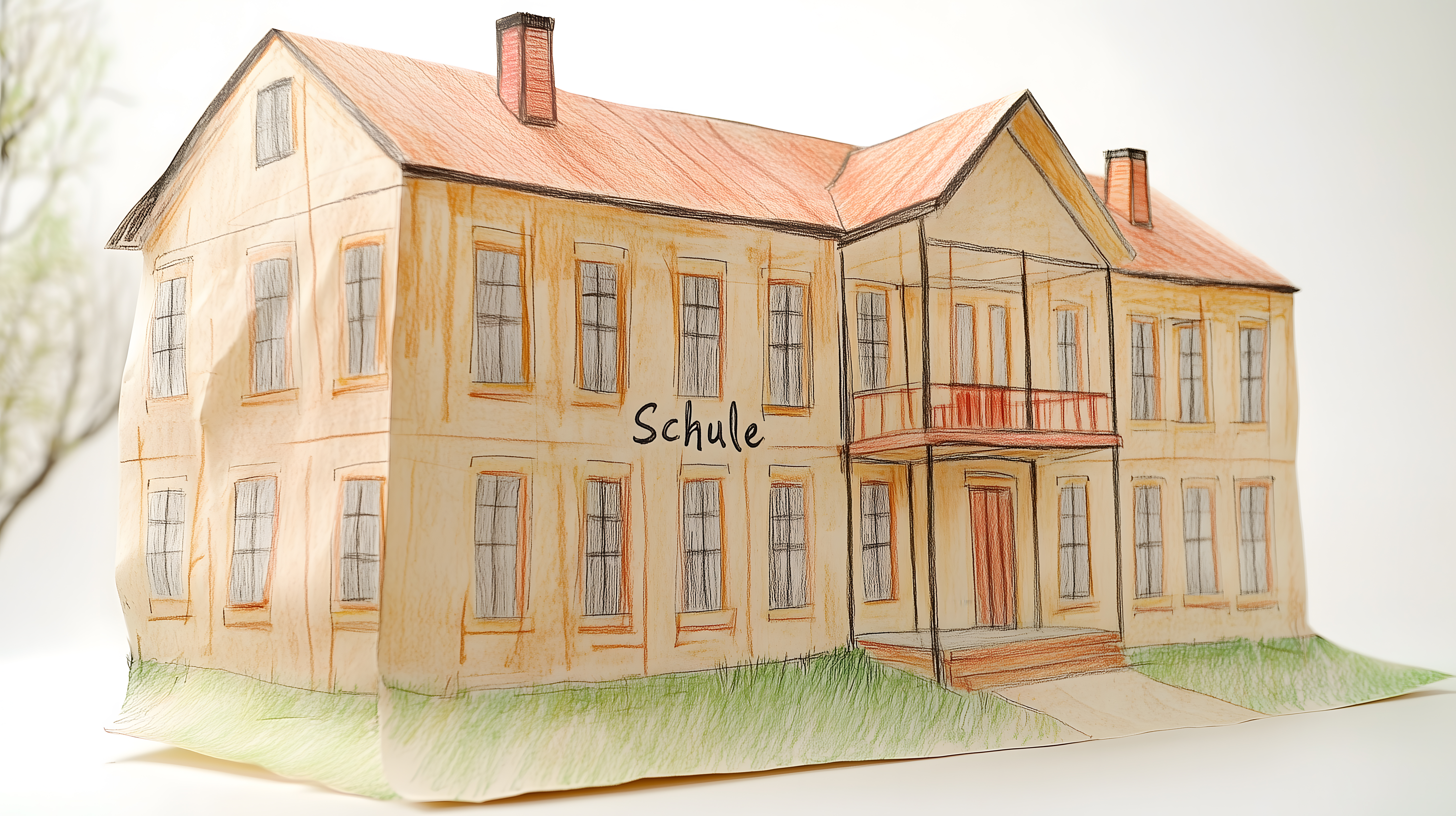 Das Bild zeigt ein historisches Schulgebäude in einer Zeichnungsoptik. Das mehrstöckige Gebäude mit Satteldach, Schornsteinen und zahlreichen Fenstern ist in erdigen Farbtönen gehalten. Auf dem Dach befindet sich der Schriftzug 'Schule'. Das Haus steht auf einer grünen Rasenfläche, die den Charakter einer ländlichen Umgebung vermittelt. Diese Illustration eignet sich hervorragend als kostenloses Stockfoto für Blogs, Newsletter oder Social-Media-Beiträge rund um die Themen Bildung, Schule und historische Architektur. Das hochauflösende Bild ist unter der Creative-Commons-Lizenz frei verwendbar.
