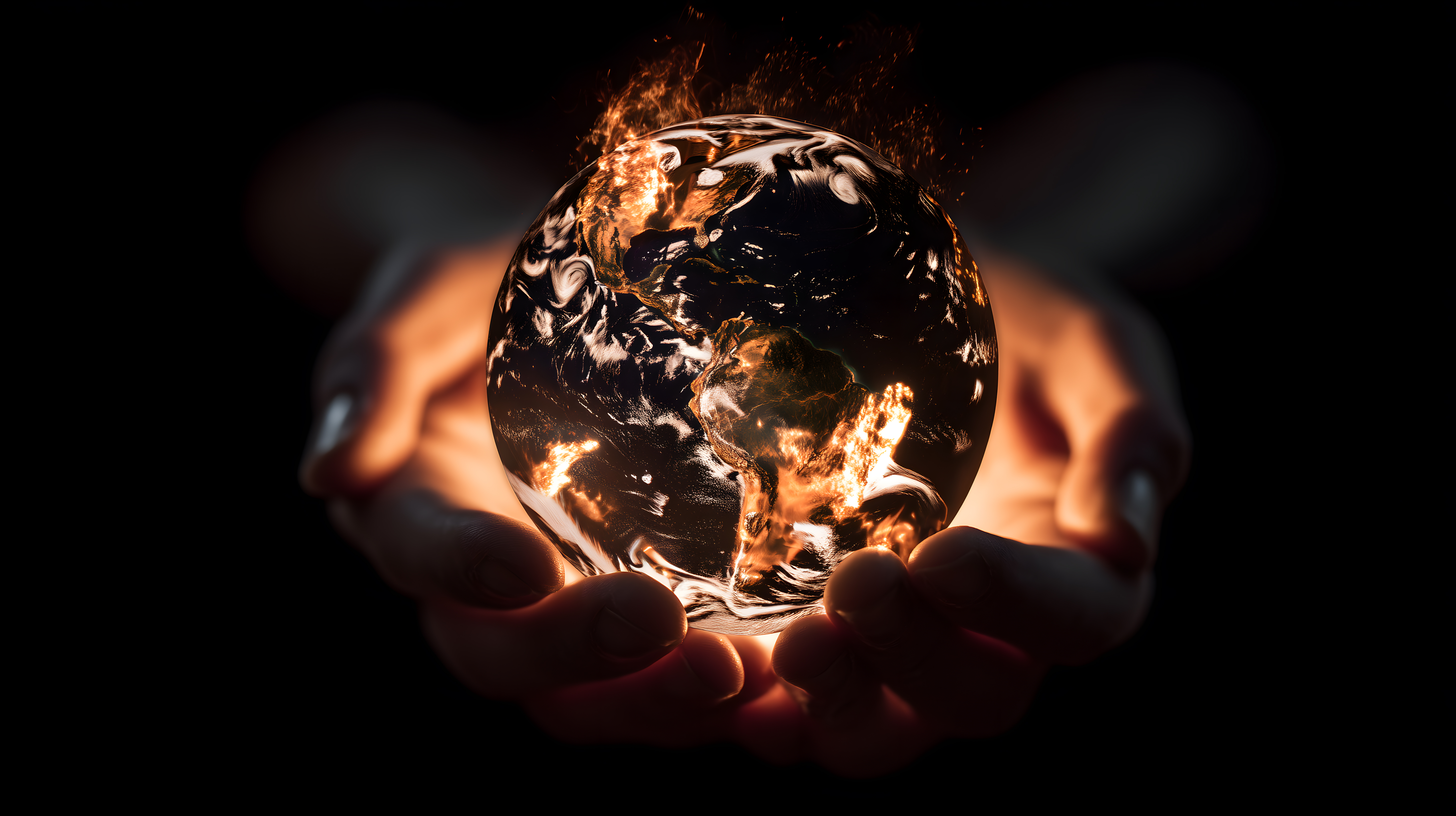 Das Foto zeigt eine glühende Erdkugel, die von menschlichen Händen umschlossen wird. Die Szene vermittelt den Eindruck einer drohenden Klimakatastrophe und einer Welt, die in Flammen zu stehen scheint. Die dunkle Umgebung und der starke Kontrast zwischen den Flammen und den schützenden Händen unterstreichen die Dringlichkeit der Situation und die Verantwortung der Menschheit für den Zustand des Planeten.