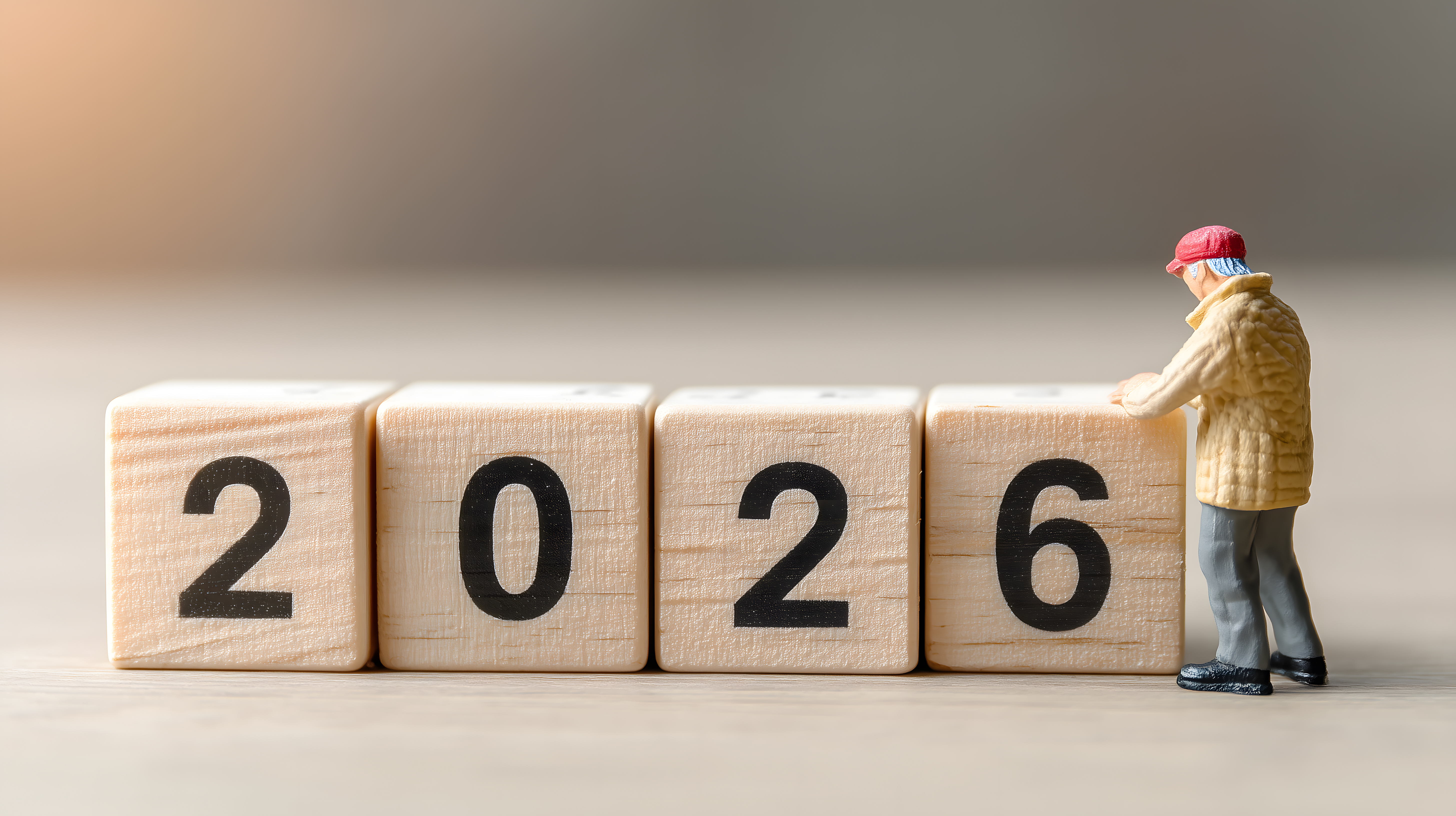 Das Bild zeigt eine Anordnung von vier Holzwürfeln, auf denen die Jahreszahl 2026 zu sehen ist. Vor den Würfeln steht eine Miniatur-Figur in einer winterlichen Jacke und Mütze. Das Arrangement hat einen minimalistischen, aufgeräumten Charakter und spielt mit der Vorstellung des neuen Jahres 2026 und den damit verbundenen Möglichkeiten und Plänen. Das Foto eignet sich hervorragend als kostenloses Stockfoto für Blog-Beiträge, Newsletter-Grafiken oder Social-Media-Postings rund um Themen wie Neujahr, Zukunftsplanung, Innovation und Kreativität. Die hochauflösende Datei steht unter der Creative-Commons-Lizenz zur freien Verwendung zur Verfügung.