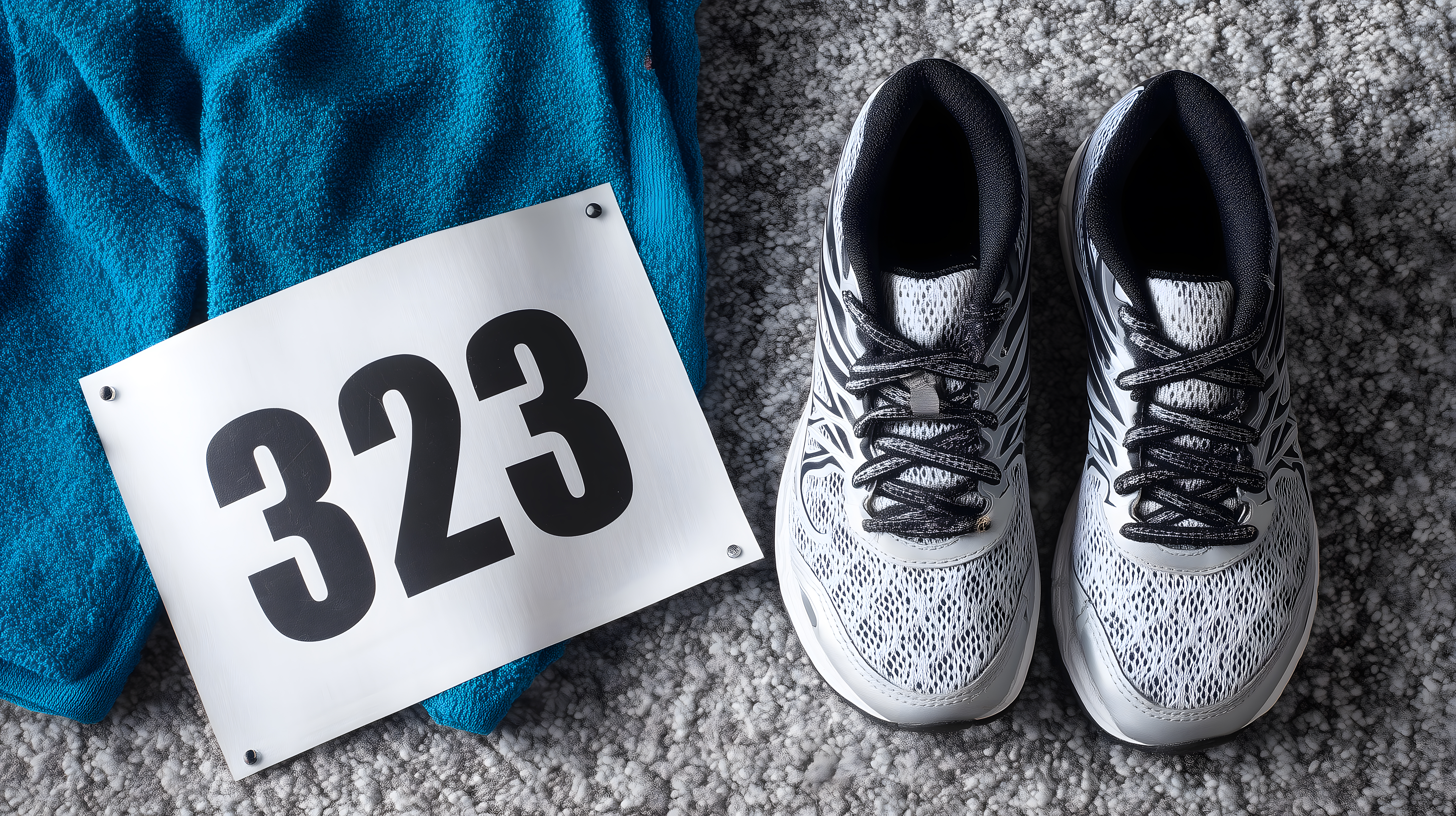 Das Bild zeigt ein stilvolles, minimalistisches Arrangement von Laufschuhen und einer Startnummer auf einem gemusterten Teppichboden. Ein blau-grünes Handtuch komplettiert die Szene. Die Draufsicht-Perspektive und der kontrastreiche, schwarz-weiße Farbton verleihen dem Foto einen modernen, reduziertem Charakter. Dieses kostenlose Stockfoto eignet sich hervorragend für Beiträge zu Themen wie Sport, Fitness, Wettkämpfe und gesunden Lebensstil. Mit seiner hohen Auflösung und dem Creative-Commons-Lizenzstatus kann es problemlos für Blogs, Newsletter, Social-Media-Kanäle oder Werbematerialien verwendet werden.