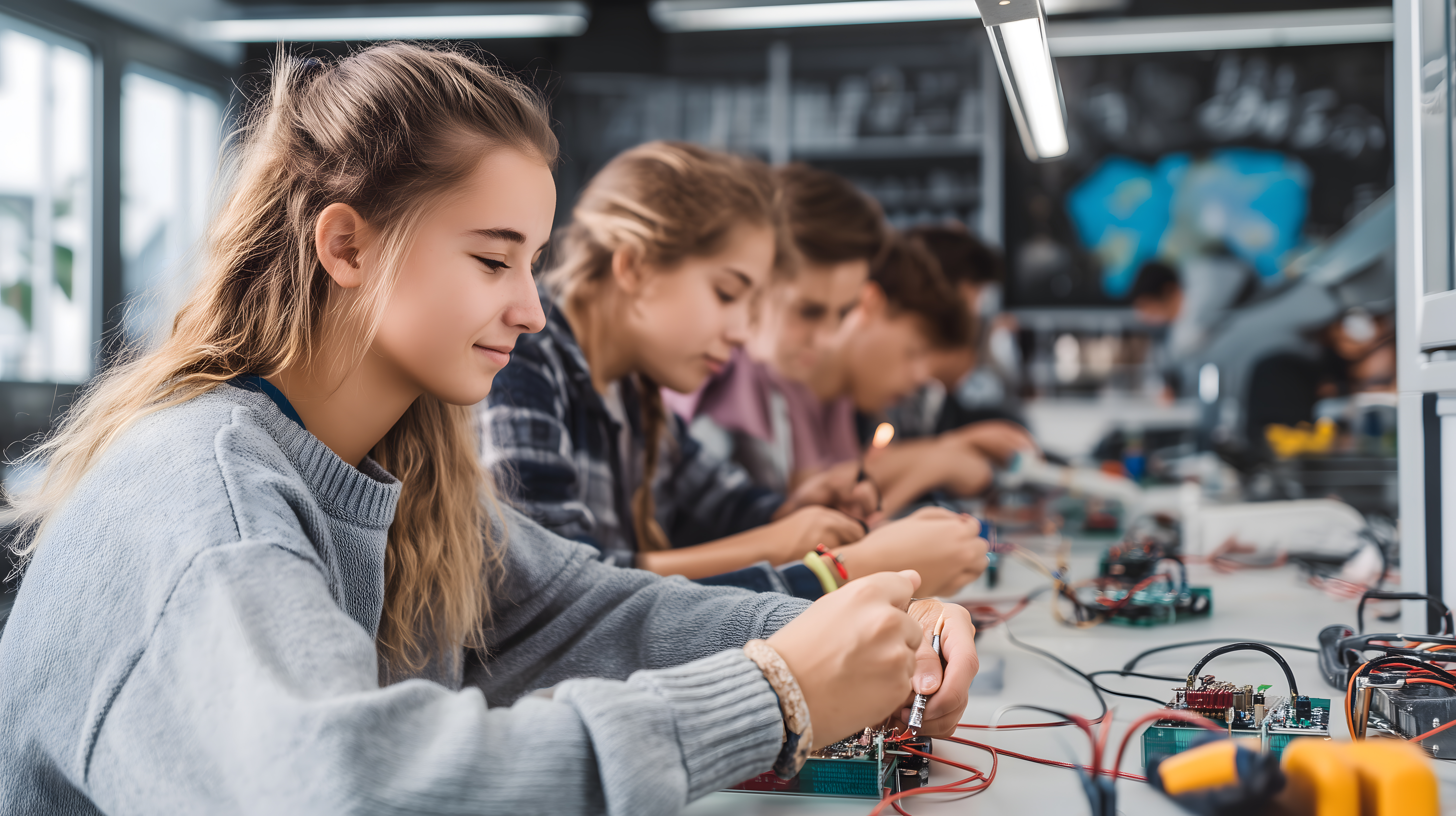 Das Foto zeigt eine Gruppe junger Frauen, die in einer modernen Werkstattumgebung zusammenarbeiten und elektronische Komponenten untersuchen. Die Szene vermittelt einen Eindruck von Kreativität, Forscherdrang und technischer Kompetenz, die in MINT-Fächern wie Elektronik erworben werden. Das Bild wäre ideal als kostenloses Stockfoto für Blog-Beiträge, Social-Media-Posts oder Werbematerialien zum Thema Bildung, Technik und Frauen in MINT-Berufen einsetzbar. Die hochauflösende Datei steht unter einer Creative-Commons-Lizenz zur Verfügung.