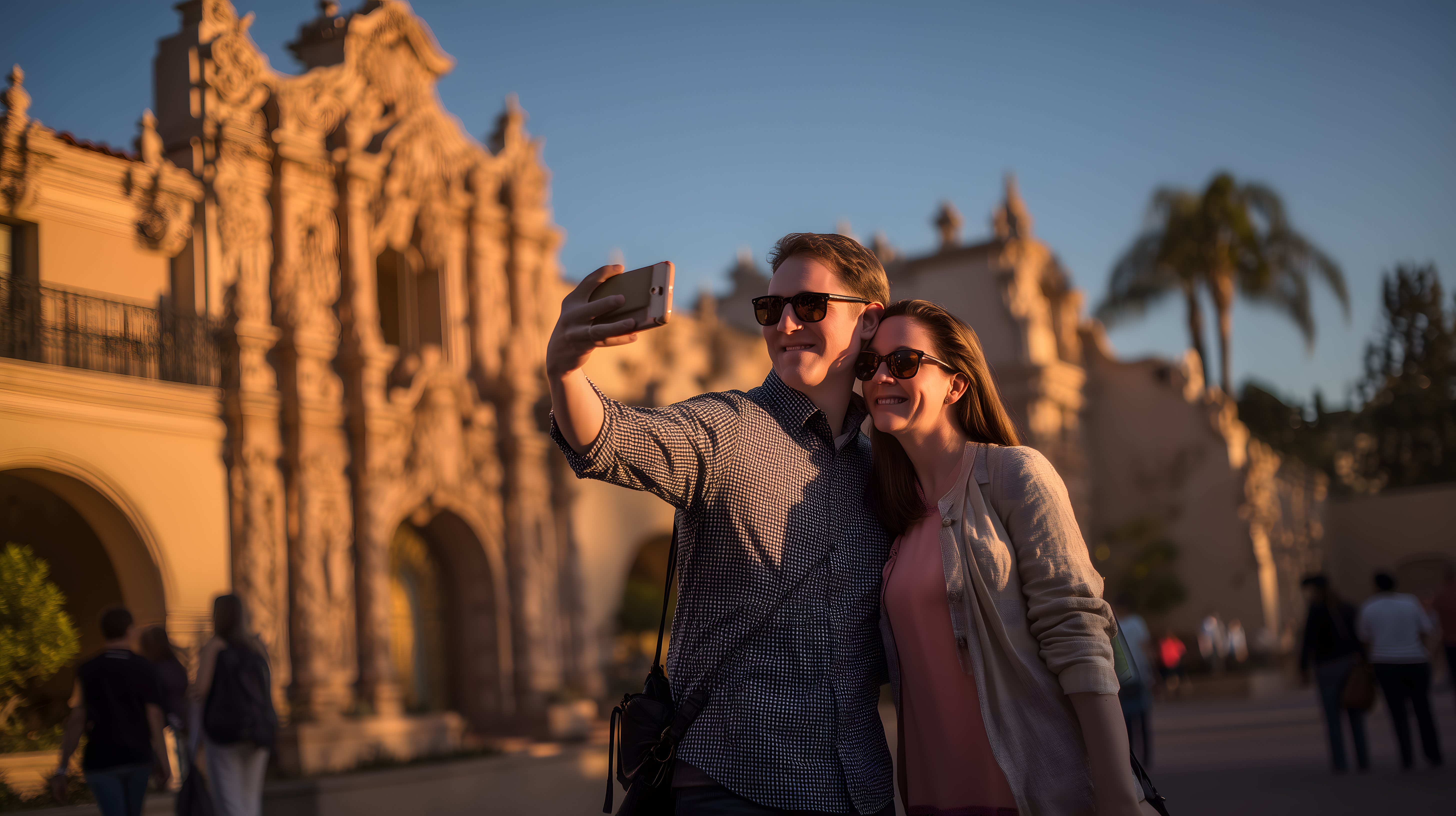 Das Bild zeigt ein glückliches Touristenpaar, das ein Selfie vor einem historischen Gebäude im Balboa Park in San Diego, Kalifornien, aufnimmt. Die warme Abendsonne taucht das Paar und das Gebäude in ein warmes, orangerotes Licht. Die beiden tragen Sonnenbrillen und haben offensichtlich ihren Urlaub in der Metropole genossen. Das Foto eignet sich hervorragend als kostenloses Stockfoto für Reise-, Urlaubs- oder Städte-Themen. Es ist in hoher Auflösung verfügbar und kann unter einer Creative-Commons-Lizenz verwendet werden.