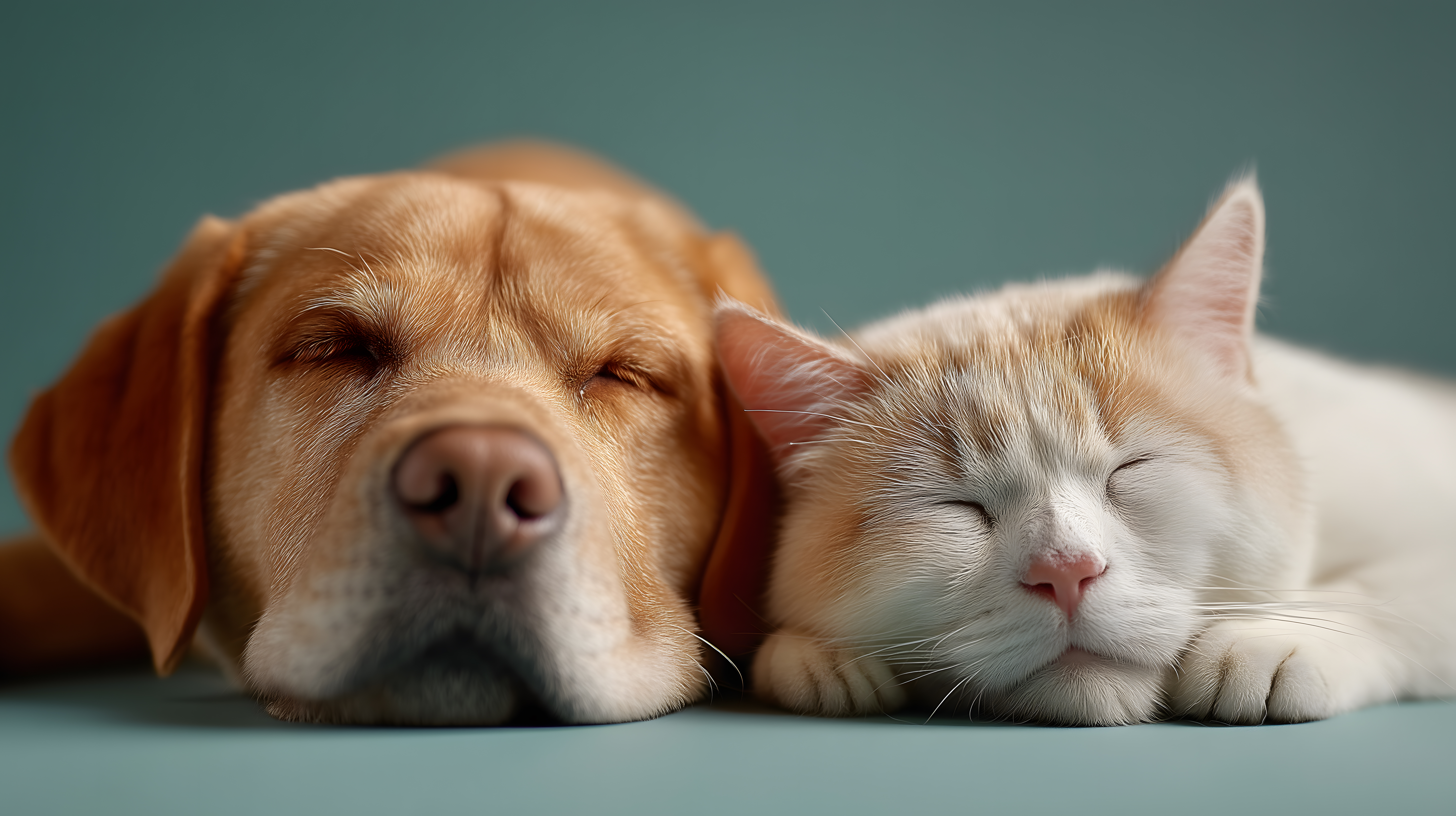 Das Bild zeigt einen Hund und eine Katze, die friedlich und entspannt nebeneinander auf einem Kissen schlafen. Der Hund, vermutlich eine Labrador-Mischung, liegt mit geschlossenen Augen da, während die Katze, mit ihren weichen, flauschigen Konturen, sich an den Hund schmiegt. Die warmen, erdigen Farbtöne und der zurückgenommene Hintergrund verleihen dem Bild eine gemütliche, intime Atmosphäre.