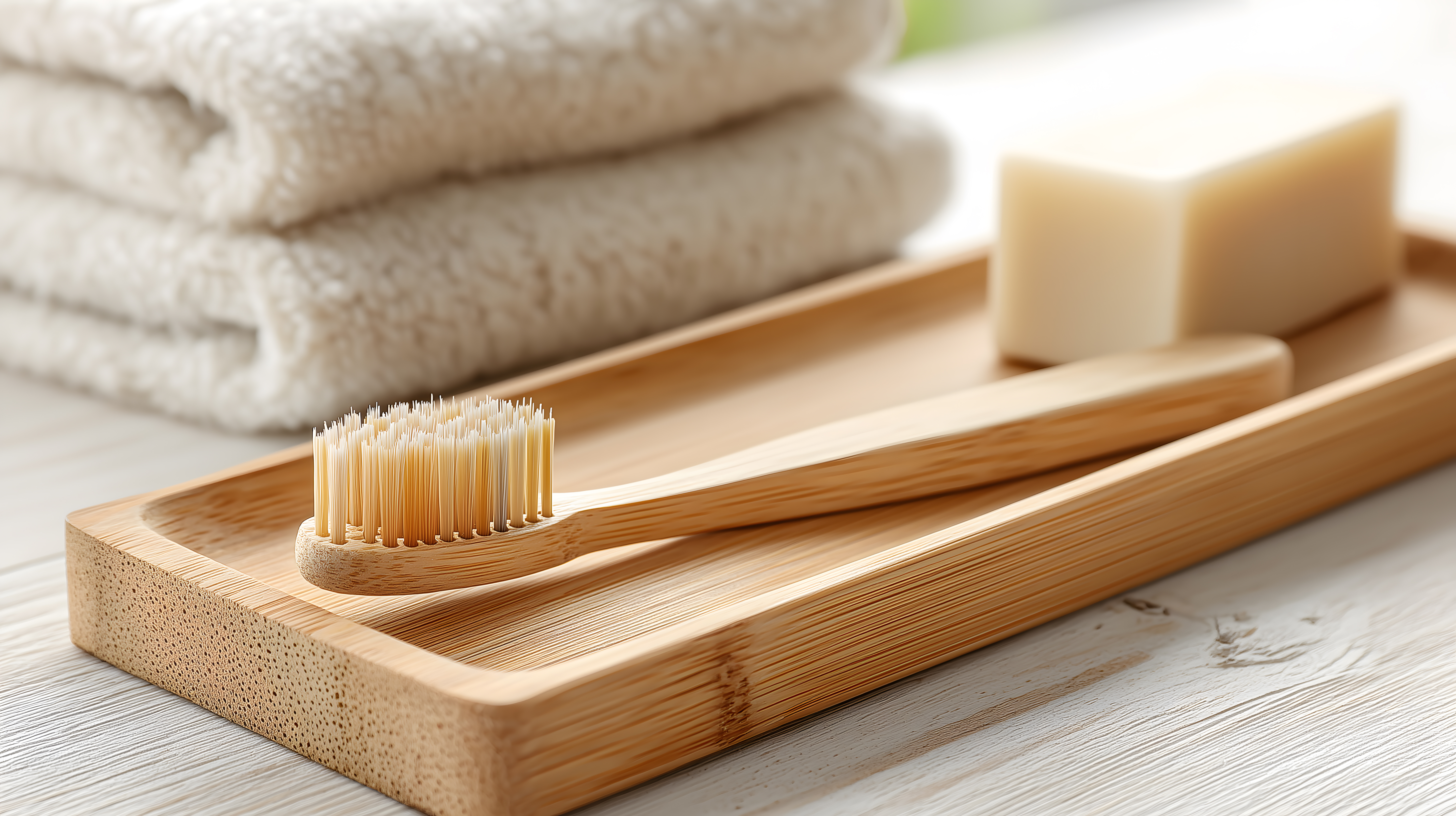 Dieses Foto zeigt eine Auswahl nachhaltiger Körperpflegeprodukte auf einem hölzernen Tablett. Im Vordergrund ist eine Bambuszahnbürste mit natürlichen Borsten zu sehen, daneben befinden sich zwei rechteckige Seifenstücke. Im Hintergrund liegen zwei weiche, flauschige Handtücher, die einen Eindruck von Gemütlichkeit und Entspannung vermitteln. Das natürliche, warme Holz und die dezente Farbgebung in Beige und Braun erzeugen eine ruhige, einladende Atmosphäre.